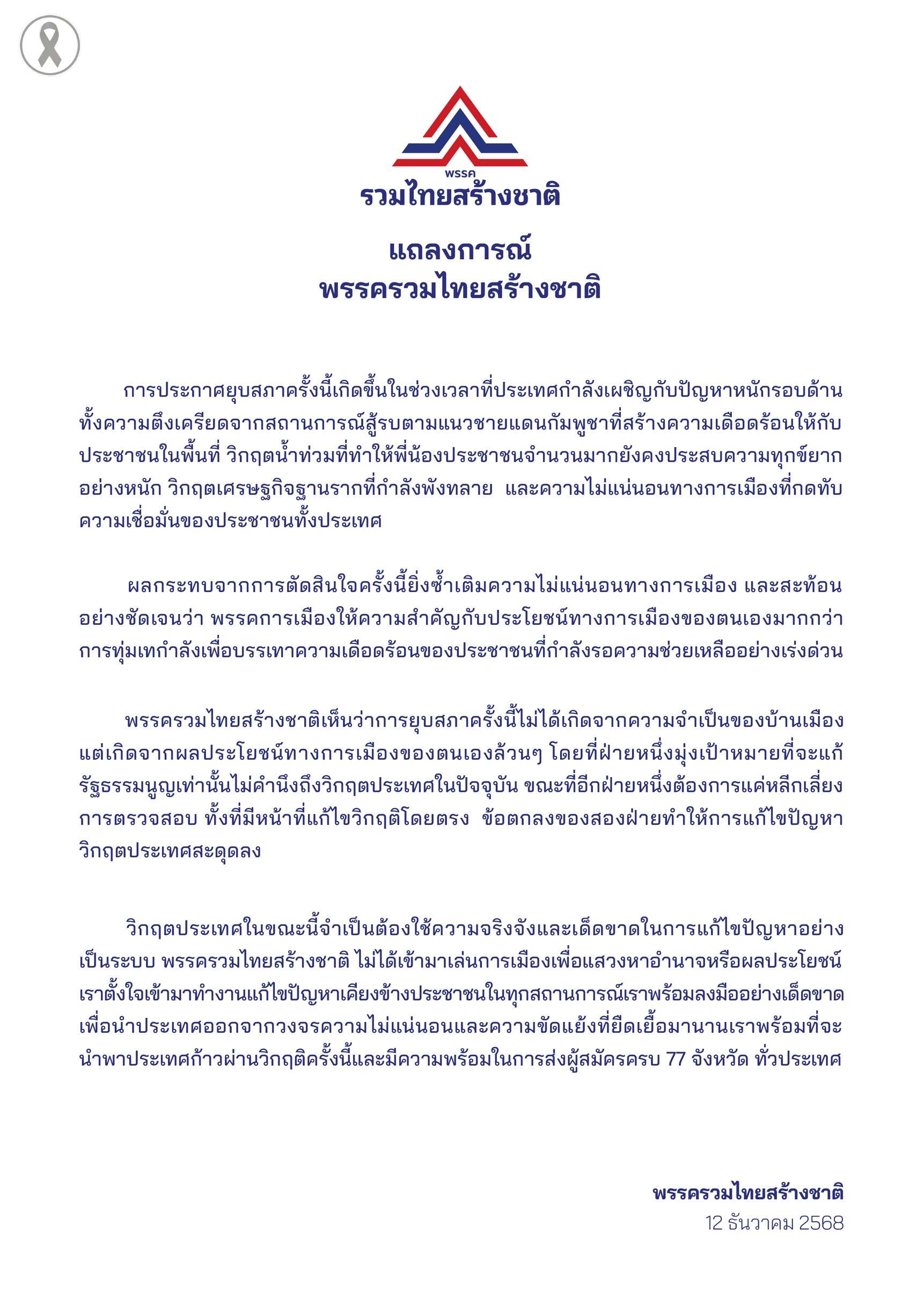 พรรครวมไทยสร้างชาติ ออกแถลงการณ์ตอบโต้การยุบสภา ระบุเป็นการตัดสินใจที่เกิดจากผลประโยชน์ทางการเมือง ไม่ใช่เพื่อแก้ปัญหาประเทศ ท่ามกลางวิกฤตชายแดน น้ำท่วม และเศรษฐกิจฐานรากพังทลาย ย้ำพร้อมส่งผู้สมัครครบ 77 จังหวัด เดินหน้าแก้วิกฤตชาติด้วยความเด็ดขาด