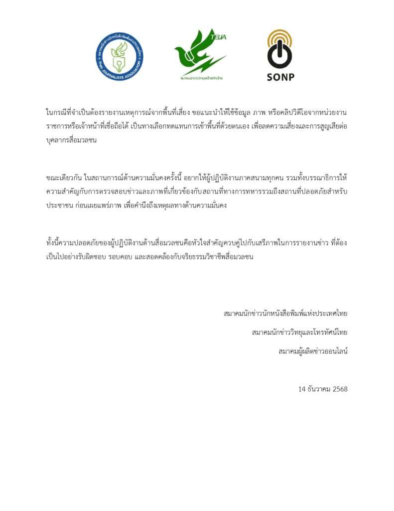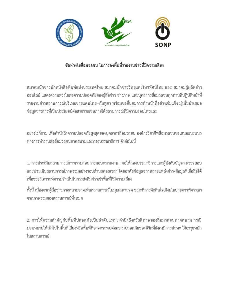 สมาคมนักข่าวนักหนังสือพิมพ์แห่งประเทศไทย สมาคมนักข่าววิทยุและโทรทัศน์ไทย และ สมาคมผู้ผลิตข่าวออนไลน์ แสดงความห่วงใยต่อความปลอดภัยของผู้สื่อข่าว ช่างภาพ และบุคลากรสื่อมวลชนทุกท่านที่ปฏิบัติหน้าที่รายงานข่าวสถานการณ์บริเวณชายแดนไทย–กัมพูชา พร้อมขอชื่นชมการทำหน้าที่อย่างเข้มแข็ง มุ่งมั่นนำเสนอข้อมูลข่าวสารที่เป็นประโยชน์ต่อสาธารณชนภายใต้สถานการณ์ที่มีความอ่อนไหวและอย่างไรก็ตาม เพื่อคำนึงถึงความปลอดภัยสูงสุดของบุคลากรสื่อมวลชน องค์กรวิชาชีพสื่อมวลชนขอเสนอแนะแนวทางการทำงานต่อสื่อมวลชนภาคสนามและกองบรรณาธิการ ดังต่อไปนี้