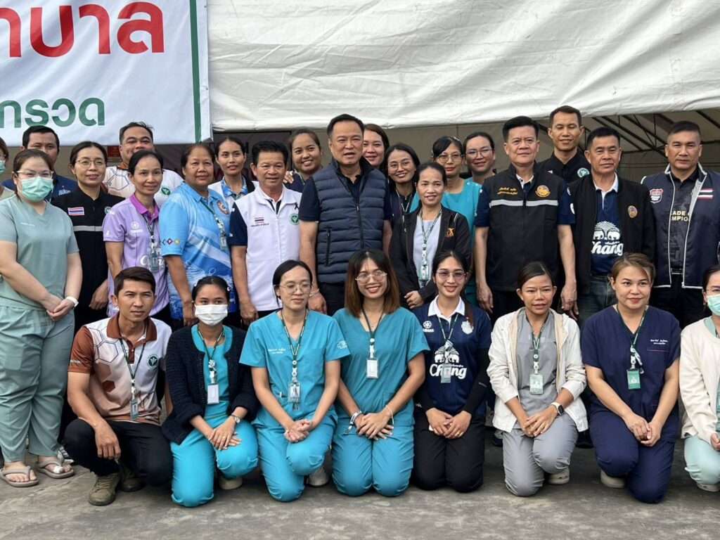 จากนั้น นายอนุทินได้ตรวจเยี่ยมเต็นท์ปฐมพยาบาลของโรงพยาบาลบ้านกรวด พูดคุยให้กำลังใจทีมแพทย์และเจ้าหน้าที่สาธารณสุข ก่อนเดินชมร้านอาหารฟู้ดทรัคที่เข้ามาบริการประชาชน และแวะทักทายประชาชนตามจุดต่าง ๆ ภายในพื้นที่อย่างใกล้ชิด ช่วงหนึ่ง นายกรัฐมนตรีได้ร่วมกิจกรรมร้องเพลงกับประชาชนและนักศึกษามหาวิทยาลัยราชภัฏบุรีรัมย์ ณ จุดพักผ่อนของศูนย์อพยพ โดยร่วมร้องเพลง “คนสุดท้าย” ของอัสนี–วสันต์ และเพลง “ซมซาน” ของโลโซ สร้างความประทับใจ และกำลังใจให้กับผู้พักพิงเป็นอย่างมาก