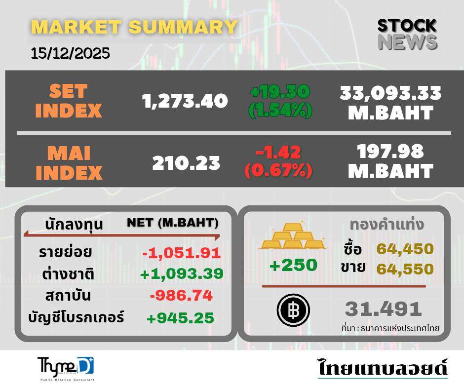 SET ปิดพุ่ง 19.30 จุดสวนทางตลาดเอเชีย รับแรงซื้อหุ้นใหญ่หลังเคาะวันเลือกตั้งชัดเจน 8 ก.พ. 69SET ปิดวันนี้ที่ 1,273.40 จุด เพิ่มขึ้น 19.30 จุด (+1.54%) มูลค่าซื้อขาย 33,093.33 ล้านบาท