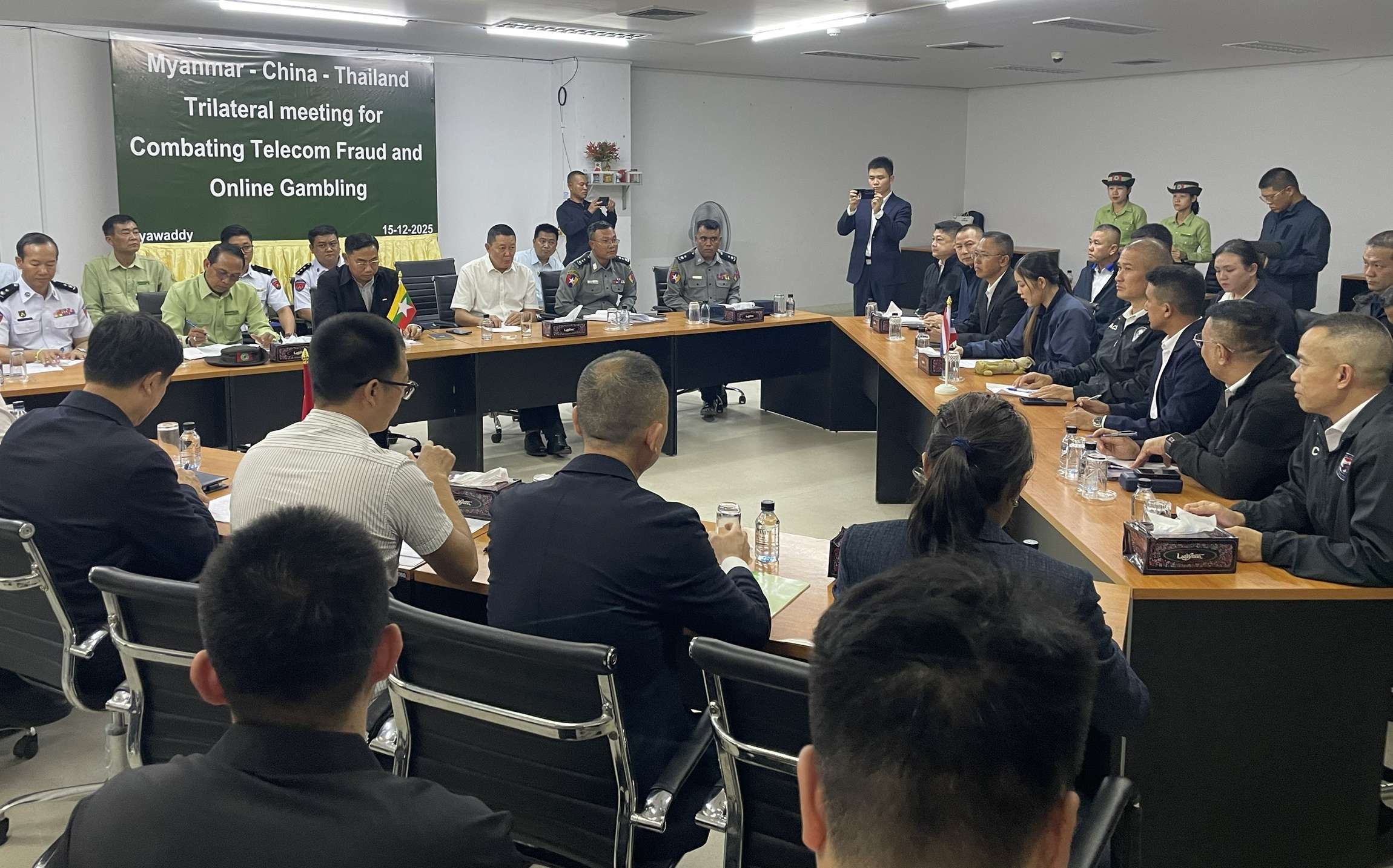 ต่อมาเวลา 14.20 น. ณ ห้องประชุมสะพานมิตรภาพแห่งที่ 2 ฝั่งเมียนมา ได้มีการประชุมไตรภาคีร่วมกันระหว่าง พล.ต.ท.จิรภพ ภูริเดช ผู้ช่วย ผบ.ตร./รอง ผอ.ศปอส.ตร. และคณะ (ผู้แทนประเทศไทย) ,พล.ต.ต.มิน ไทก์ เมียว (Min Htike Myo) รองผู้บัญชาการตำรวจเมียนมา และคณะ (ผู้แทนสาธารณรัฐแห่งสหภาพเมียนมา) และนายหลิวจงอี้ ผู้ช่วยรัฐมนตรีกระทรวงความมั่นคงสาธารณะ สาธารณรัฐประชาชนจีน และคณะ (ผู้แทนสาธารณรัฐประชาชนจีน) โดยได้ข้อสรุปมาตรการขั้นเด็ดขาด