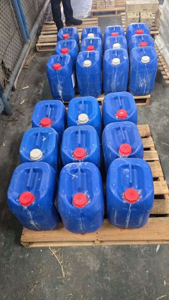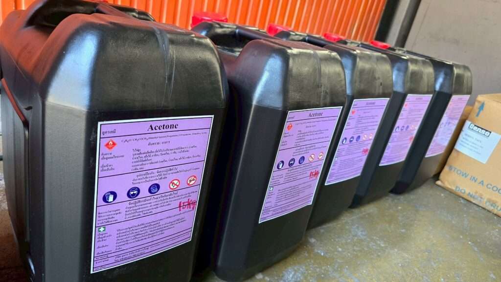 จากการเข้าตรวจค้นภายในโรงงานวันนี้ เจ้าหน้าที่พบสารเคมีและเคมีภัณฑ์ รวมปริมาณ 1,245 กิโลกรัม ประกอบด้วย คลอรีนน้ำ จำนวน 21 ถัง (420 กิโลกรัม), อะซีโตน จำนวน 10 ถัง (150 กิโลกรัม) บอแร็กซ์ จำนวน 27 กระสอบ (675 กิโลกรัม) ซึ่งสารเคมีดังกล่าว จัดเป็นวัตถุอันตรายชนิดที่ 1 และ 3 เป็นสารเคมีจำเป็นในขั้นตอนการฟอก และตกผลึกยาเสพติด (ยาบ้า/ไอซ์/เฮโรอีน) ซึ่งอยู่ภายใต้การ ควบคุมของกรมโรงงานอุตสาหกรรม จากการตรวจสอบไม่พบการขึ้นทะเบียนเป็นวัตถุอันตรายและไม่มีใบอนุญาตครอบครอง​ เจ้าหน้าที่จึงต้องทำการตรวจยึด เพื่อสกัดกั้นและป้องกันการกระจายของสารตั้งต้นเหล่านี้เข้าสู่กระบวนการผลิตยาเสพติด