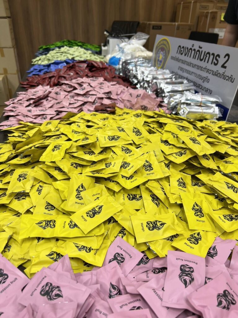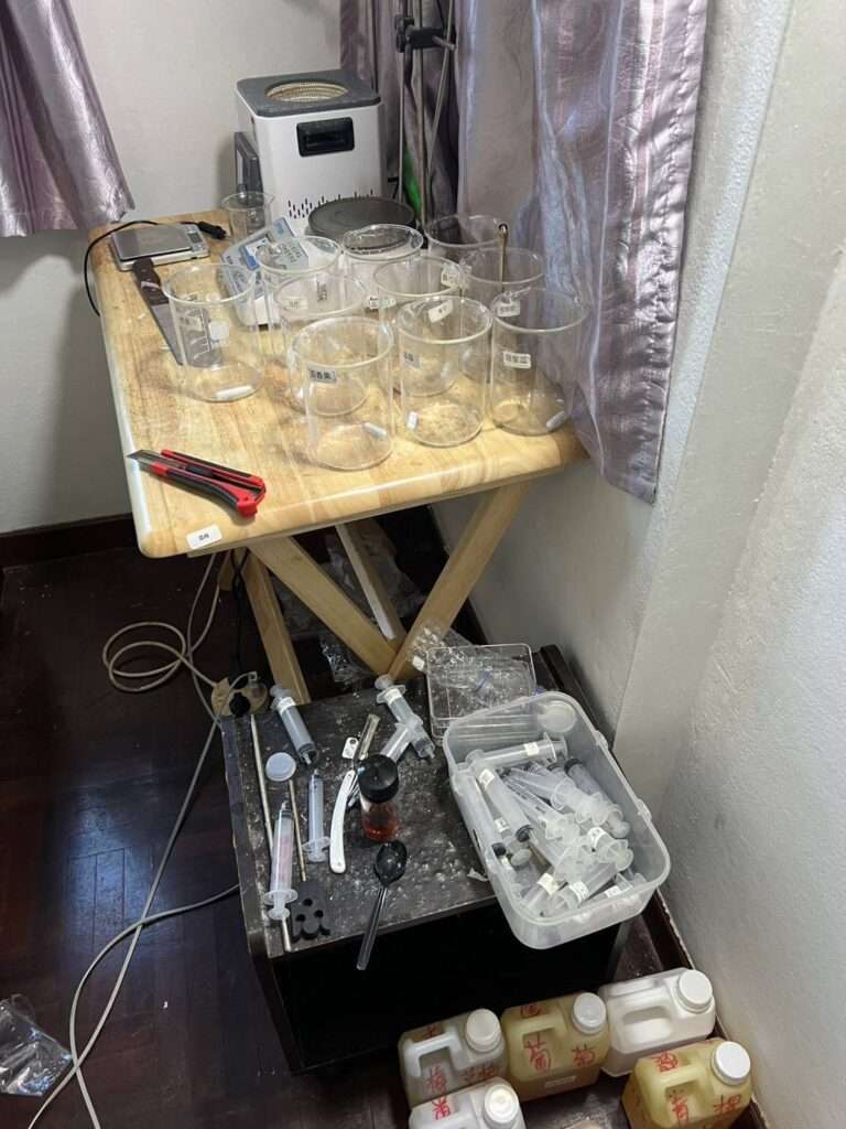ตรวจยึดของกลาง 1.หัวบุหรี่ไฟฟ้าพร้อมใช้บรรจุถุง (พอตเค) จำนวน 4,945 ซอง 2.หัวบุหรี่ไฟฟ้าเปล่า 15,000 หัว 3.คอยส์หัวบุหรี่ไฟฟ้า 18,000 ชิ้น 4.ตัวเครื่องบุหรี่ไฟฟ้า 300 ชิ้น 5.น้ำยาบุหรี่ไฟฟ้า 85 แกลลอน 6.จุกปิดหัวบุหรี่ไฟฟ้า 50,000 ชิ้น 7.ซองบรรจุภัณฑ์ 8 ลัง 8.เครื่องซีลสุญญากาศ 4 เครื่อง 9.เครื่องทำความร้อน 5 เครื่อง 10.ตาชั่ง 5 เครื่อง 11.บีกเกอร์/สายยาง/ตัวทำละลาย 12.ผงสีขาวขุ่น และ ใส (อยู่ระหว่างส่งตรวจพิสูจน์สารเอโทมิเดต-เป็นวัตถุออกฤทธิ์ต่อจิตประสาทประเภท 2 ที่ใช้ในการผลิตหัวพอตเค) จำนวน 11 ถุง น้ำหนักรวมกว่า 3,800 กรัม สถานที่จับกุม บ้านแห่งหนึ่ง ซอย 15 หมู่ที่ 10 ต.หนองปรือ อ.บางละมุง จ.ชลบุรี