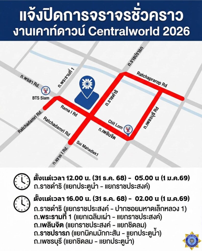 กองบัญชาการตำรวจนครบาล ประชาสัมพันธ์แจ้งประชาชนให้ทราบถึงการปิดการจราจรเป็นการชั่วคราว ในพื้นที่ใจกลางกรุงเทพมหานคร เพื่อรองรับการจัดงานเฉลิมฉลองส่งท้ายปีเก่า ต้อนรับปีใหม่ “งานเคาท์ดาวน์ Central World 2026” ซึ่งคาดว่าจะมีประชาชนและนักท่องเที่ยวจำนวนมากเข้าร่วมกิจกรรม