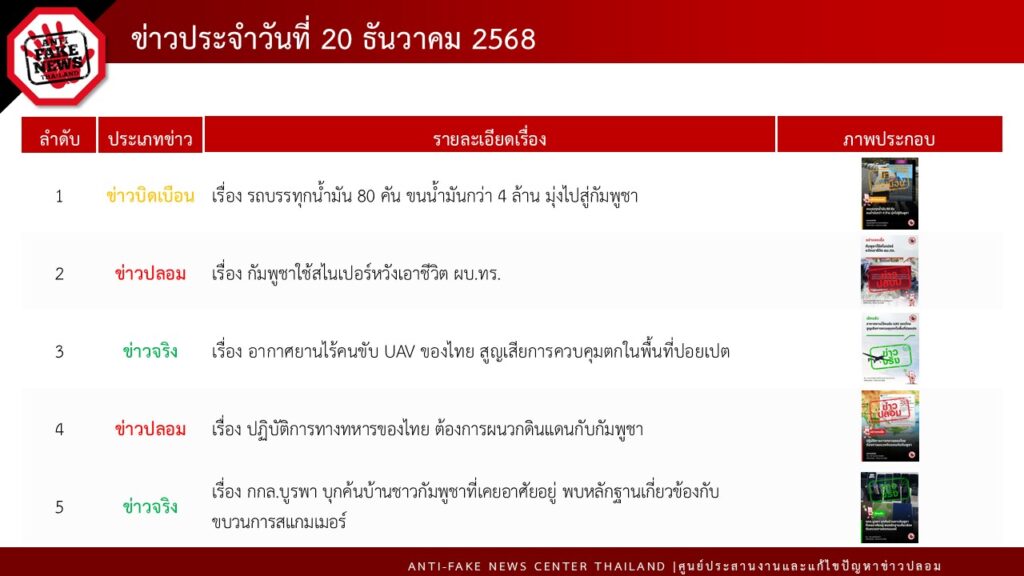 หากประชาชน พบข่าวน่าสงสัย ข้อมูลบิดเบือน สามารถแจ้งเบาะแส และตรวจสอบข่าวปลอมได้ที่ โทรสายด่วน 1111 ต่อ 87 (24 ชม.) หรือที่ | เว็บไซต์ www.antifakenewscenter.com | Line ID: @antifakenewscenter | Facebook : Anti-Fake News Center Thailand | X : @AFNCThailand | TikTok : @antifakenewscenter | IG : afnc_thailand/