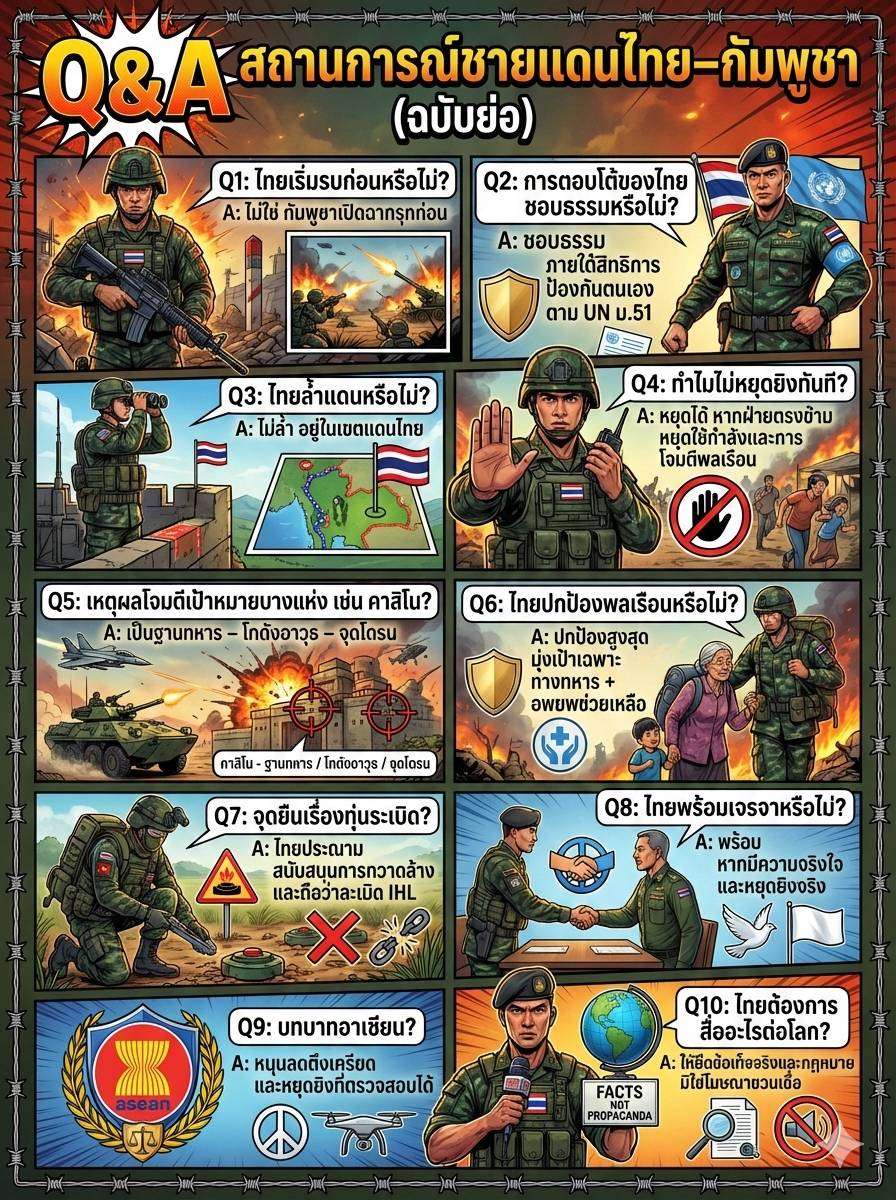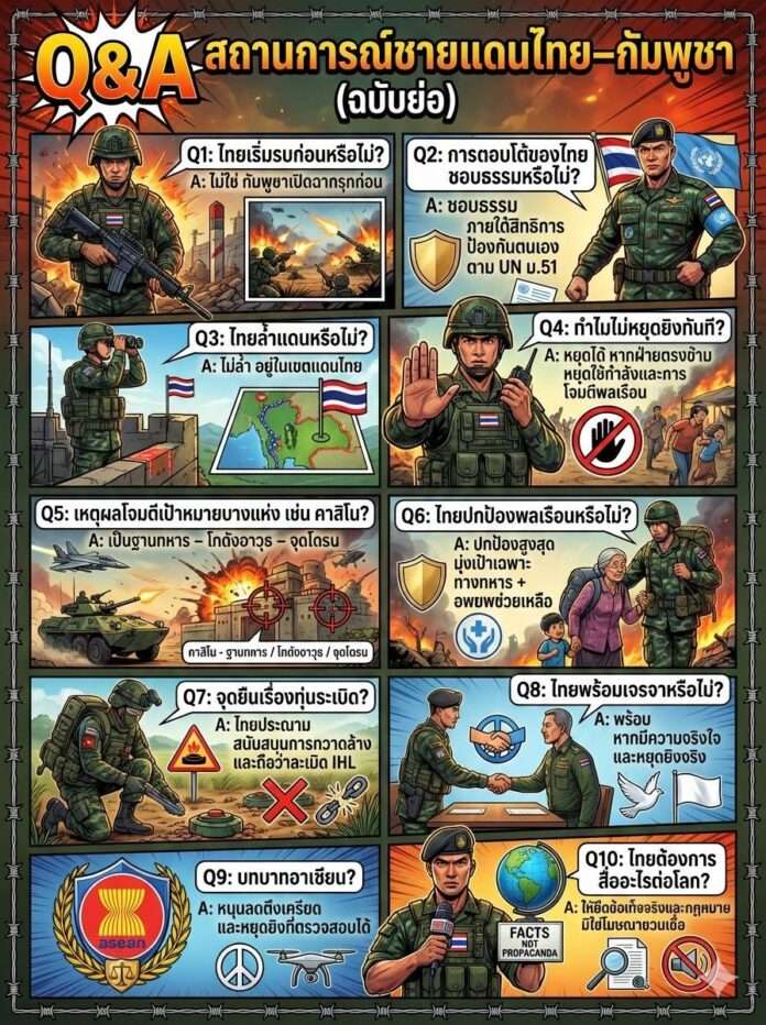 กองทัพออกการ์ตูน Q&A สื่อสารประชาคมโลก ยึดข้อเท็จจริง–กฎหมายระหว่างประเทศ ยืนยันไทยป้องกันตนเอง ไม่รุกล้ำดินแดนใคร คำนึงความปลอดภัยพลเรือนเป็นหลัก