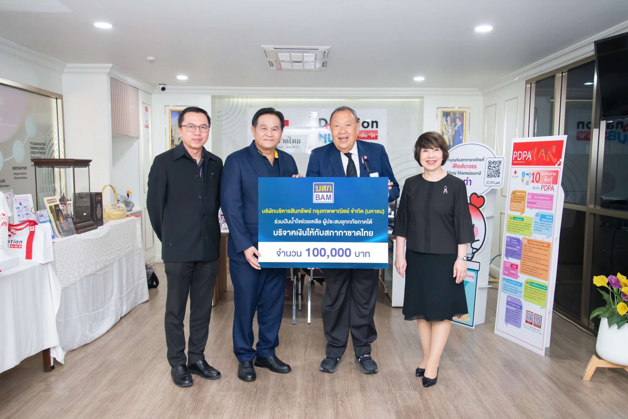 คุณสมพร มูลศรีแก้ว ผู้จัดการใหญ่ สายธุรกิจ คุณวุฒิพงศ์ บุญยะสิทธิ์ ผู้ช่วยประธานเจ้าหน้าที่บริหาร สายพัฒนาสินทรัพย์ภูมิภาค 2 บริษัทบริหารสินทรัพย์ กรุงเทพพาณิชย์ จำกัด (มหาชน) หรือ BAM มอบเงินสมทบโครงการปันน้ำใจช่วยเหลือผู้ประสบอุทกภัยในพื้นที่ภาคใต้ ให้กับสภากาชาดไทย จำนวน 100,000 บาท โดยมีคุณขรรค์ ประจวบเหมาะ ผู้อำนวยการสำนักงานจัดหารายได้ และคุณจันทร์ประภา วิชิตชลชัย รองผู้อำนวยการสำนักงานจัดหารายได้ เป็นผู้แทนรับมอบ ณ สำนักงาน จัดหารายได้ สภากาชาดไทย … BAM ขอเป็นกำลังใจให้ทุกคนก้าวผ่านช่วงวิกฤตนี้ไปด้วยกัน และพร้อมเคียงข้างสังคมไทยในทุกช่วงเวลา