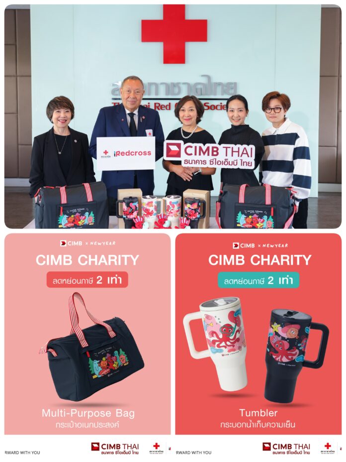 ธนาคาร ซีไอเอ็มบี ไทย และ Donation HUB สภากาชาดไทย ผู้พัฒนาแพลตฟอร์ม iRedcross ผนึกกำลังร่วมกันเปิดตัว CIMB CHARITY : CIMB x NEWYEAR อย่างเป็นทางการ โดยมี อุทัยวรรณ สุขพรรณพิมพ์ ผู้ช่วยกรรมการผู้จัดการใหญ่ Brand & Marketing และ ณัฐณี เกษมรัฐกุล ผู้อำนวยการอาวุโส สื่อสารองค์กร ธนาคาร ซีไอเอ็มบี ไทย พร้อมด้วย ขรรค์ ประจวบเหมาะ ผู้อำนวยการสำนักงานจัดหารายได้ สภากาชาดไทย และ จันทร์ประภา วิชิตชลชัย รองผู้อำนวยการสำนักงานจัดหารายได้ สภากาชาดไทย ร่วมกันเป็นประธานเปิดตัวของขวัญคอลเล็กชันพิเศษ
