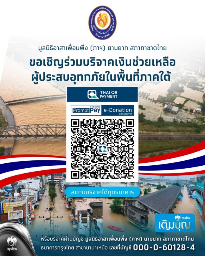 นอกจากนี้ ธนาคารร่วมกับ มูลนิธิอาสาเพื่อนพึ่ง (ภาฯ) ยามยาก สภากาชาดไทย เปิดรับบริจาคจากผู้มีจิตศรัทธา เพื่อส่งต่อความช่วยเหลือให้แก่ผู้ประสบอุทกภัย ผ่านมูลนิธิอาสาเพื่อนพึ่ง (ภาฯ) ยามยากสภากาชาดไทย ด้วยการสแกน QR Code E-Donation ผ่านแอปพลิเคชันของทุกธนาคาร ซึ่งข้อมูลการบริจาคจะส่งเข้าระบบลดหย่อนภาษีของกรมสรรพากรอัตโนมัติ หรือ บริจาคผ่านบัญชี ออมทรัพย์ ชื่อบัญชีมูลนิธิอาสา เพื่อนพึ่ง (ภาฯ) ยามยาก สภากาชาดไทย ธนาคารกรุงไทย สาขานานาเหนือ เลขที่ 000-0-601-28-4 หรือดูรายละเอียดเพิ่มเติมได้ที่https://krungthai.com/link/edonation-flood2025