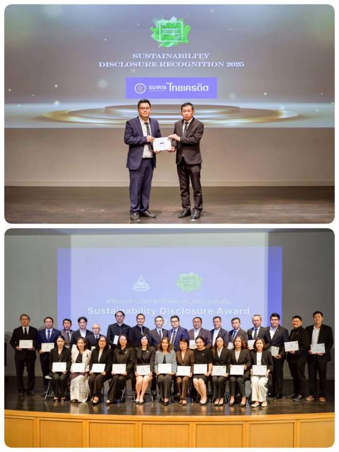ธนาคารไทยเครดิต จำกัด (มหาชน) ได้รับรางวัลประกาศเกียรติคุณ Sustainability Disclosure Recognition โดยมี นายศราวุธ เศวตณรงค์ ผู้ช่วยกรรมการผู้จัดการสายงานบริหารทรัพยากรบุคคลและผู้บริหารระบบการจัดการสิ่งแวดล้อมและสังคม ธนาคารไทยเครดิต จำกัด (มหาชน) เป็นผู้แทนธนาคาร เข้ารับมอบรางวัลจาก นายวรณัฐ เพียรธรรม ผู้อำนวยการ สถาบันไทยพัฒน์ ในพิธีมอบรางวัลการเปิดเผยข้อมูลความยั่งยืน ประจำปี 2568 จัดโดยสถาบันไทยพัฒน์ เมื่อวันที่ 25 พฤศจิกายน 2568 ณ ห้องออดิทอเรียม ชั้น 5 หอศิลปวัฒนธรรมแห่งกรุงเทพมหานคร โดยมีองค์กรชั้นนำจากหลากหลายอุตสาหกรรมเข้าร่วมรับรางวัลกว่า 163 ราย