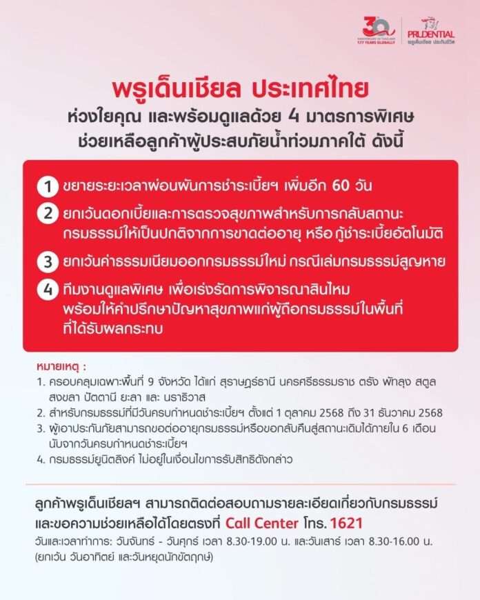 พรูเด็นเชียล ประเทศไทย ห่วงใยคุณ พร้อมดูแลด้วย 4 มาตรการพิเศษช่วยเหลือลูกค้าผู้ประสบภัยน้ำท่วมภาคใต้