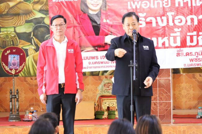 นครพนม, วันที่ 23 ธ.ค. นางมนพร เจริญศรี อดีต สส.เขต 2 นครพนม พร้อมด้วยนายเอกพร รักความสุข อดีต สส.บัญชีรายชื่อพรรคเพื่อไทย ลงพื้นที่ปราศรัยย่อย ตามชุมชนหมู่บ้าน สนับสนุน ดร.ภูมิพัฒน์ พชรทรัพย์ อดีต สส.เขต 1 นครพนม หาเสียงชูนโยบายพรรคเพื่อไทย ภายใต้สโลแกนการยกเครื่องเพื่อไทย เพื่อไทยทำได้ เน้นการพัฒนาโครงสร้างพื้นฐาน กระตุ้นเศรษฐกิจการท่องเที่ยว รวมถึงการแก้หนี้สินในครัวเรือน นอกจากนี้ยังย้ำผลกระทบต่อประเทศไทย จากปัญหาการตั้งรัฐบาลเสียงข้างน้อย รวมถึง การยุบสภา ทำให้การพัฒนาประเทศหยุดชะงัก โดยไม่คำนึ่งถึงความเป็นอยู่ประชาชน