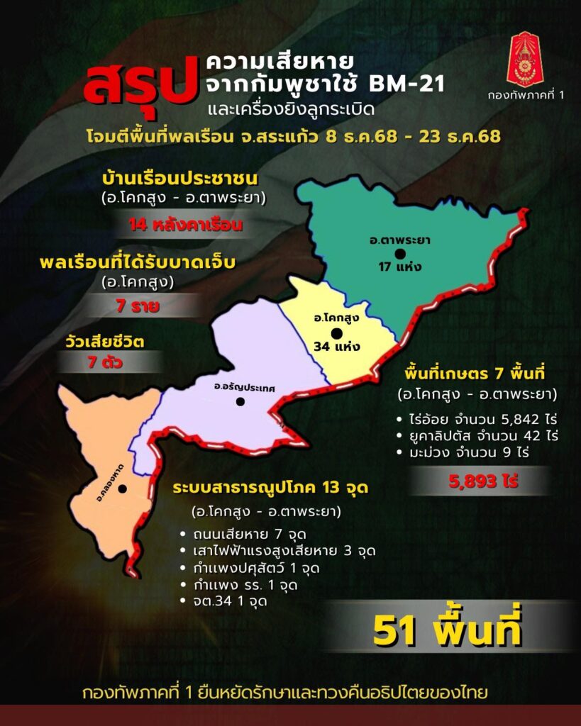 กองทัพบกประณามกัมพูชาใช้อาวุธจรวด BM-21 โจมตีพื้นที่พลเรือนสระแก้ว ทำชาวบ้านเจ็บสาหัสหลายราย