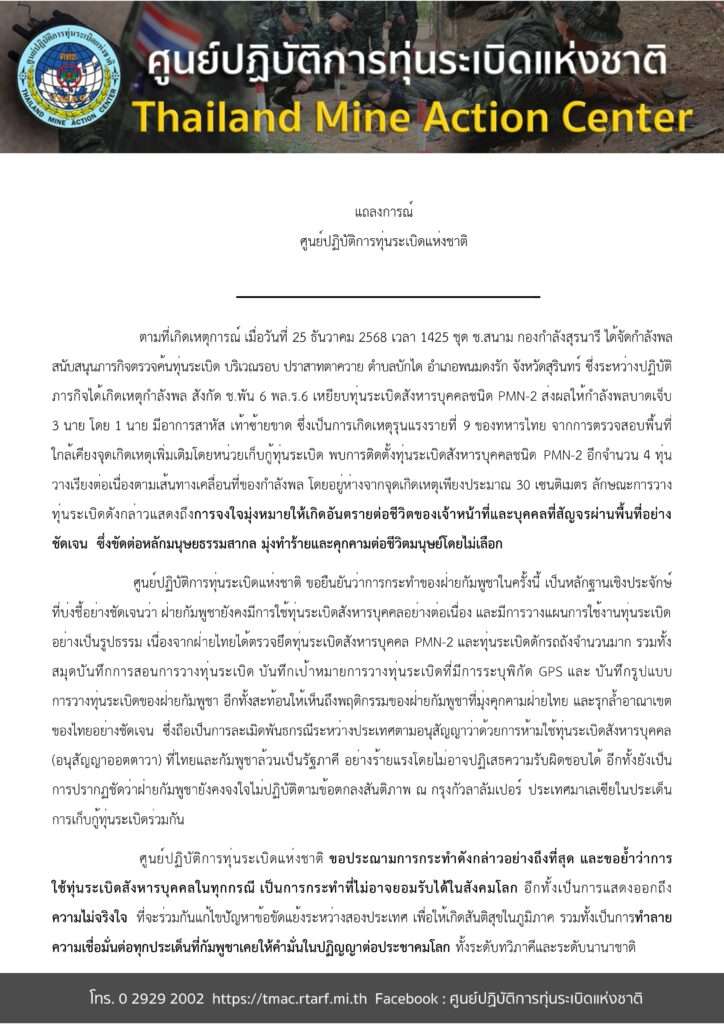 ศูนย์ปฏิบัติการทุ่นระเบิดแห่งชาติ ขอยืนยันว่า การกระทำของฝ่ายกัมพูชาในครั้งนี้ เป็นหลักฐานเชิงประจักษ์ ที่บ่งชี้อย่างชัดเจนว่า ฝ่ายกัมพูชายังคงมีการใช้ทุ่นระเบิดสังหารบุคคลอย่างต่อเนื่อง และมีการวางแผนการใช้งานทุ่นระเบิดอย่างเป็นรูปธรรม เนื่องจากฝ่ายไทยได้ตรวจยึดทุ่นระเบิดสังหารบุคคล PMN-2 และทุ่นระเบิดดักรถถังจำนวนมาก รวมทั้งสมุดบันทึกการสอนการวางทุ่นระเบิด บันทึกเป้าหมายการวางทุ่นระเบิดที่มีการระบุพิกัด GPS และ บันทึกรูปแบบ การวางทุ่นระเบิดของฝ่ายกัมพูชา อีกทั้งสะท้อนให้เห็นถึงพฤติกรรมของฝ่ายกัมพูชาที่มุ่งคุกคามฝ่ายไทย และรุกล้ำอาณาเขตของไทยอย่างชัดเจน ซึ่งถือเป็นการละเมิดพันธกรณีระหว่างประเทศตามอนุสัญญาว่าด้วยการห้ามใช้ทุ่นระเบิดสังหารบุคคล (อนุสัญญาออตตาวา) ที่ไทยและกัมพูชาล้วนเป็นรัฐภาคี อย่างร้ายแรงโดยไม่อาจปฏิเสธความรับผิดชอบได้ อีกทั้งยังเป็น การปรากฏชัดว่าฝ่ายกัมพูชายังคงจงใจไม่ปฏิบัติตามข้อตกลงสันติภาพ ณ กรุงกัวลาลัมเปอร์ ประเทศมาเลเซียในประเด็นการเก็บกู้ทุ่นระเบิดร่วมกัน