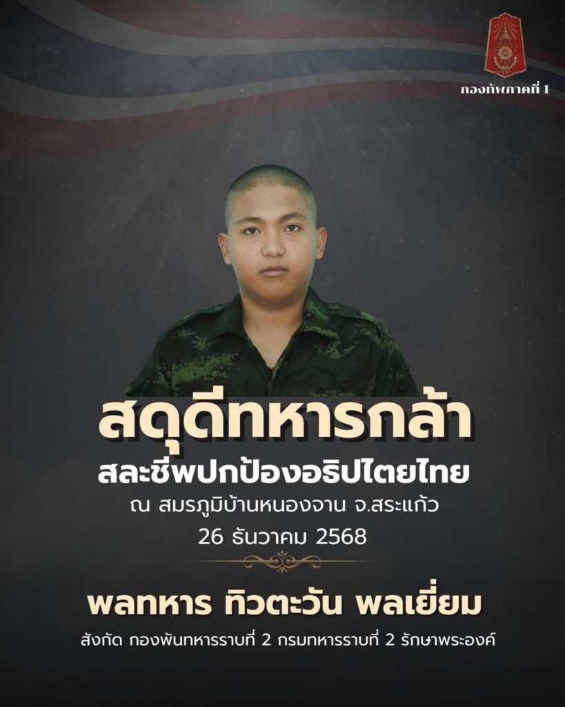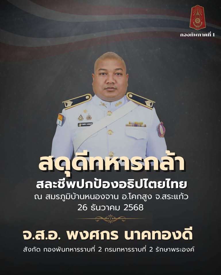 กองทัพภาคที่ 1 ขอแสดงความเสียใจอย่างสุดซึ้งต่อครอบครัว จ.ส.อ.พงศกร นาคทองดี, พลทหาร ปฏิพัทธ์ ศรประดิษฐ์ และพลทหาร ทิวตะวัน พลเยี่ยม สังกัด กองพันทหารราบที่ 2 กรมทหารราบที่ 2 รักษาพระองค์ เสียชีวิตจากการปฏิบัติหน้าที่ปกป้องอธิปไตยของชาติ ในพื้นที่ชายแดนไทย-กัมพูชา บ้านหนองจาน อ.โคกสูง จ.สระแก้ว เมื่อ 26 ธ.ค.68