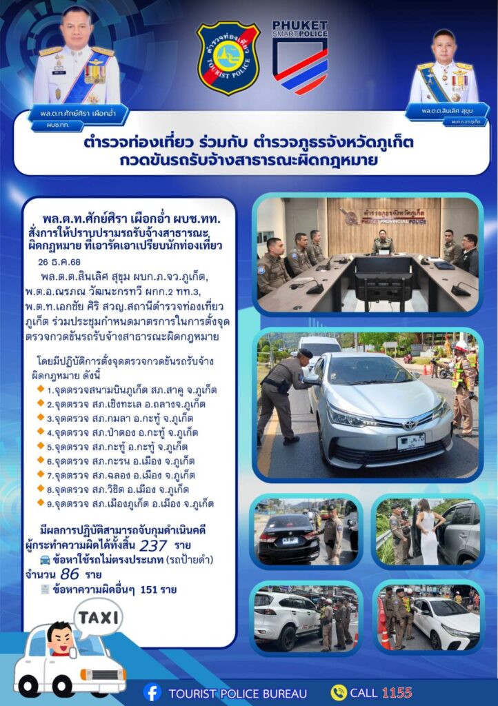 ตำรวจท่องเที่ยวสนธิกำลังตำรวจภูเก็ต เปิดปฏิบัติการเข้มรับไฮซีซั่น ปูพรมตั้งด่านตรวจทั่วเกาะภูเก็ต 9 จุด จัดหนักรถรับจ้างผิดกฎหมาย เรียกราคาโหด เอาเปรียบนักท่องเที่ยว จับกุมผู้กระทำผิดรวม 237 ราย