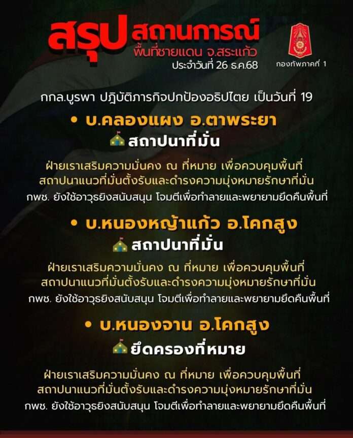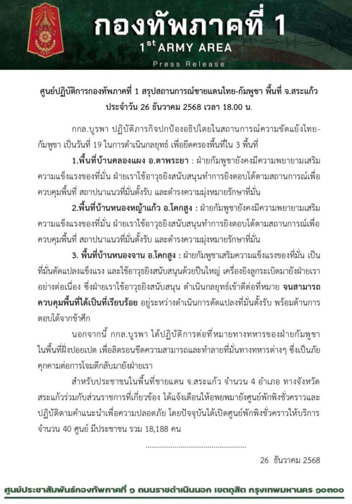 Sa Kaeo ProvinceAs of 26 December 2025, 1800 hrs**The First Army Area Operations Center provides the following update on the Thai–Cambodian border situation in Sa Kaeo Province: