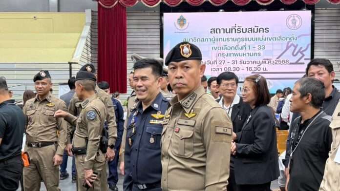 วันนี้ (27 ธ.ค.) เมื่อเวลา 10.20 น. วันที่ 27 ธ.ค. พล.ต.ท.สยาม บุญสม ผบช.น. ได้เดินทางมาตรวจเยี่ยมดูแลความเรียบร้อย การปฏิบัติหน้าที่ของเจ้าหน้าที่ตำรวจในบริเวณศูนย์เยาวชนกรุงเทพมหานคร (ไทย-ญี่ปุ่น ดินแดน) ในการรับสมัครรับเลือกตั้งสมาชิกสภาผู้แทนราษฎรกรุงเทพมหานครแบบแบ่งเขตเลือกตั้ง วันแรก