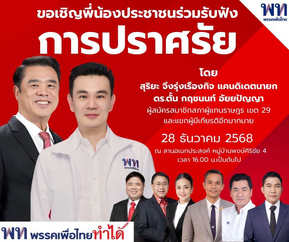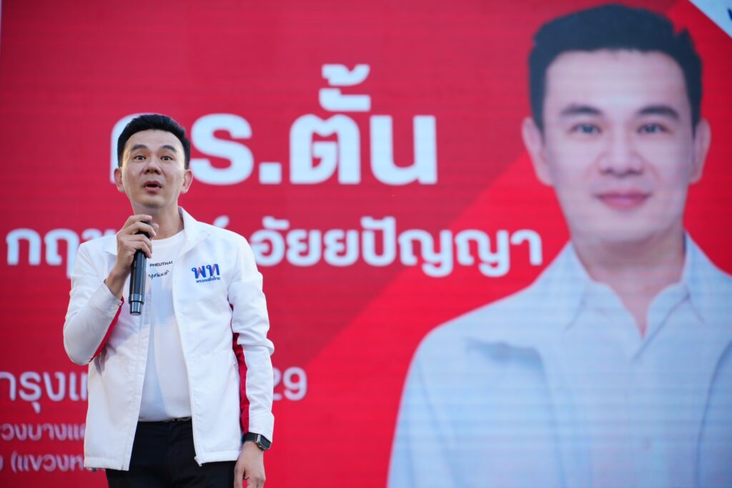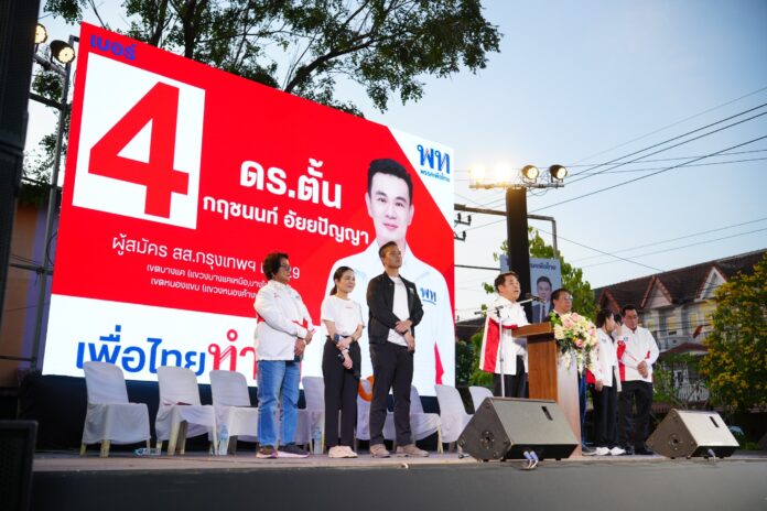 กรุงเทพฯ, 28 ธ.ค. – นายสุริยะ จึงรุ่งเรืองกิจ ผู้อำนวยการการเลือกตั้ง และแคนดิเดตนายกรัฐมนตรีพรรคเพื่อไทย พร้อมด้วย นายศึกษิษฏ์ ศรีจอมขวัญ โฆษกพรรค จักรภพ เพ็ญแข ผู้สมัคร สส. แบบบัญชีรายชื่อ นางสุภาภรณ์ คงวุฒิปัญญา ผู้สมัคร สส. แบบบัญชีรายชื่อ นายนวรัตน์ อยู่บำรุง , นายสุพิน คล้ายนก และน.ส. ขัตติยา สวัสดิผล รองเลขาธิการพรรค ขึ้นปราศรัยย่อยเวทีแรกในพื้นที่ กทม. ที่ลานเอนกประสงค์ หมู่บ้านพงษ์ศิริชัย 4 ช่วย ดร.ตั้น กฤชนนท์ อัยยปัญญา เบอร์ 4 อดีตผู้ช่วยรัฐมนตรีประจำกระทรวงคมนาคม เป็นผู้สมัคร สส. เขต 29 บางแค (เฉพาะแขวงบางไผ่-แขวงบางแคเหนือ) หนองแขม (เฉพาะแขวงหนองค้างพลู)