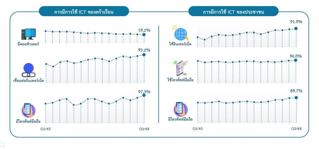 สนง.สถิติฯ เผยผลการสำรวจการมี การใช้ ICT ในครัวเรือน ไตรมาส 3/2568 พบเพิ่มขึ้นทุกมิติ มีมือถือ 97.3% แต่มีคอมพ์ใช้เหลือเพียง 19.2%