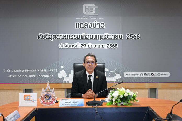 กรุงเทพฯ, 29 ธันวาคม – นายศุภกิจ บุญศิริ ผู้อำนวยการสำนักงานเศรษฐกิจอุตสาหกรรม (สศอ.) เปิดเผยดัชนีผลผลิตอุตสาหกรรม (MPI) เดือน พ.ย.68 ว่า อยู่ที่ระดับ 90.54 หดตัวร้อยละ 4.24 เมื่อเทียบกับช่วงเดียวกันของปีก่อน (YoY) ขณะที่อัตราการใช้กำลังการผลิตอยู่ที่ร้อยละ 55.49 เนื่องจากการผลิตอุตสาหกรรมปิโตรเลียมลดลงจากการหยุดผลิตชั่วคราวเพื่อซ่อมบำรุงโรงกลั่นครั้งใหญ่ เงินบาทแข็งค่าส่งผลให้ราคาสินค้าส่งออกของไทยเพิ่มสูงขึ้น และกระทบความสามารถในการแข่งขันด้านราคาของไทย ประกอบกับสถานการณ์น้ำท่วมภาคใต้ส่งผลให้ภาคการผลิตในพื้นที่ต้องหยุดผลิตชั่วคราว และสถานการณ์ชายแดนไทย-กัมพูชากระทบการค้าชายแดน