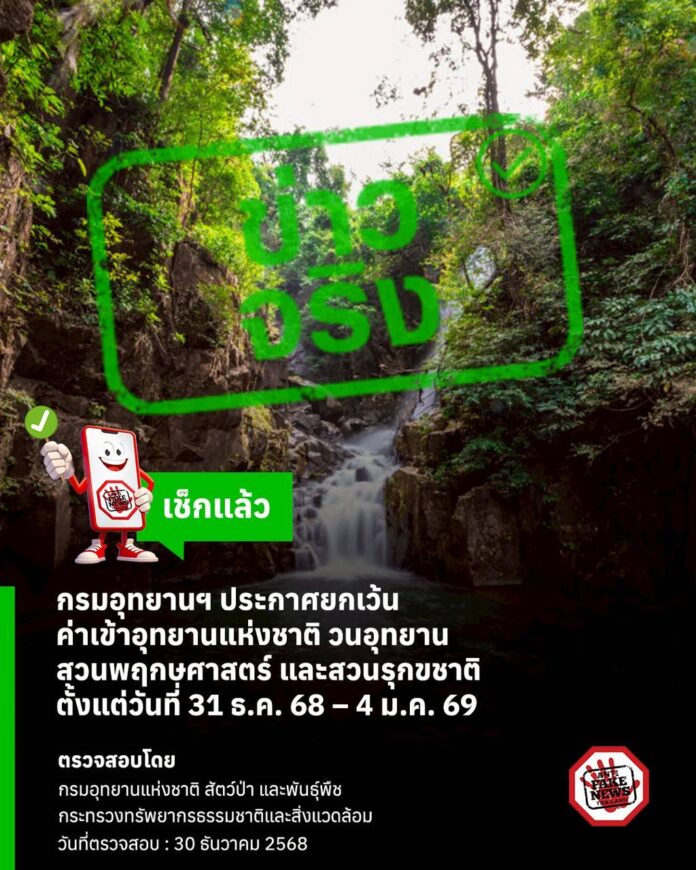 กรมอุทยานฯ ได้ยกเว้นค่าบริการเข้าอุทยานแห่งชาติ วนอุทยาน สวนพฤกษศาสตร์ และสวนรุกขชาติ รวมถึงเขตรักษาพันธุ์สัตว์ป่าและเขตห้ามล่าสัตว์ป่า (เฉพาะพื้นที่ที่กำหนดให้เป็นพื้นที่ศึกษาธรรมชาติ) โดยกำหนดยกเว้นค่าบริการตั้งแต่วันที่ 31 ธันวาคม 2568 – 4 มกราคม 2569