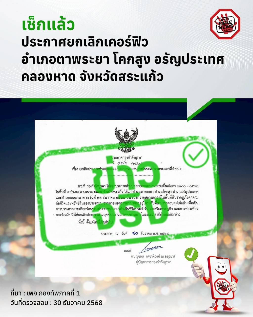 ตามที่กองกำลังบูรพาได้ออกประกาศห้ามบุคคลออกนอกเคหสถานตั้งแต่เวลา 19.00 – 05.00 น. ในพื้นที่ 4 อำเภอ ตามแนวชายแดน จ.สระแก้ว วันที่ 10 ธ.ค. 68 นั้น เนื่องจากสถานการณ์ในพื้นที่ที่ปรากฏภัยคุกคาม ต่อชีวิตและทรัพย์สินของประชาชน จากภายนอกราชอาณาจักรอยู่ในระดับที่สามารถควบคุมได้แล้ว จังหวัดจึงให้ยกเลิกประกาศห้ามบุคคลออกนอกเคหสถานภายในระยะเวลาที่กำหนดดังกล่าว