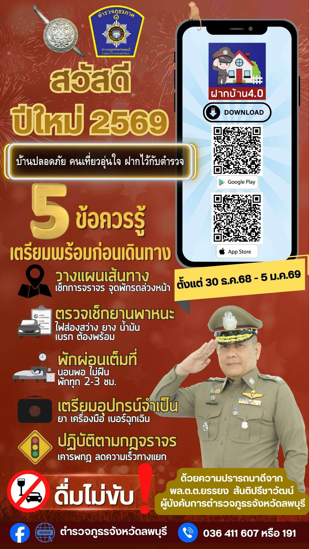 ตำรวจภูธรจังหวัดลพบุรี ขอความร่วมมือจากประชาชนทุกคนร่วมกันสร้างความปลอดภัยในการเดินทาง พร้อมส่งมอบความปรารถนาดีให้ทุกครอบครัวมีความสุข อุ่นใจ และเดินทางกลับบ้านโดยสวัสดิภาพตลอดช่วงเทศกาลปีใหม่ 2569