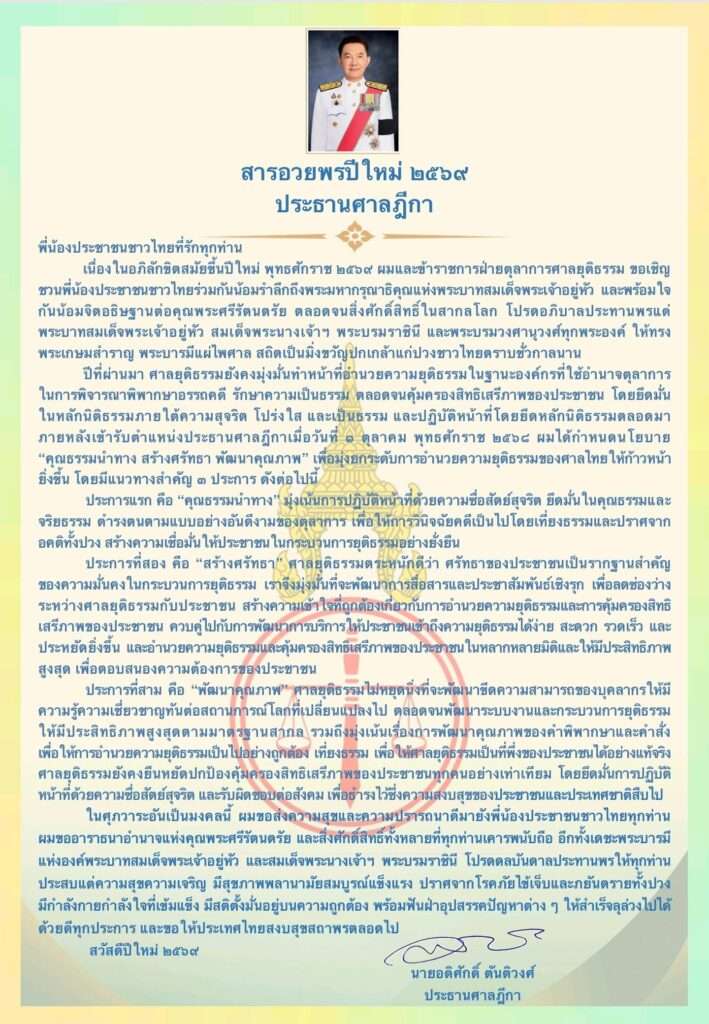 หน้าแรกกระบวนการยุติธรรมประธานศาลฎีกา ส่งสารอวยพรปีใหม่ 2569 กระบวนการยุติธรรม ประธานศาลฎีกา ส่งสารอวยพรปีใหม่ 2569 By Thaitabloid3 1 ม.ค. 2026 0 737 แบ่งปัน FacebookTwitterPinterestWhatsApp FacebookFacebookXTwitterLINELine นายอดิศักดิ์ ตันติวงศ์ ประธานศาลฎีกา ส่งสารอวยพรปีใหม่ 2569 FacebookFacebookXTwitterLINELine แบ่งปัน FacebookTwitterPinterestWhatsApp บทความก่อนหน้านี้“ยศชนัน” นำทีมเพื่อไทยทำบุญรับปีใหม่ ลงพื้นที่ตลาดยิ่งเจริญ ย้ำพร้อมสานต่อนโยบาย ลดรายจ่าย เพิ่มรายได้ประชาชนบทความถัดไปขาช้อปต้องรู้!! มาตรการเก็บภาษีสินค้านำเข้าตั้งแต่บาทแรกเริ่มแล้ววันนี้ เสื้อผ้าแพงขึ้น 20-30% รบ.ชี้สร้างความเป็นธรรมให้ SME ไทย Thaitabloid3 RELATED ARTICLES กระบวนการยุติธรรม ศาลอาญาคดีทุจริตฯ ยกฟ้อง “อนุวัฒน์-ประสิทธิ์ศักดิ์” ไม่ผิด 157 ปม “รองโจ๊ก” ฟ้องคลิปเสียงเเทรกเเซงคดี 28 ม.ค. 2026 กระบวนการยุติธรรม ผบช.ก. จ่อเร่งสอบปากคำแพทย์ คลี่ปมข้อเท็จจริง “รองโจ๊ก” ทำร้ายลูกน้อง ส่วนคดีสินบนทองคำ ยันชัด ตำรวจมีอำนาจหน้าที่ 28 ม.ค. 2026 กระบวนการยุติธรรม ตำรวจ ปอศ. บุกทลายเครือข่ายลักลอบจำหน่ายแก๊สหัวเราะรายใหญ่กลางกรุง รวบ 5 จีนเทา ยึดของกลาง 1,770 ถัง มูลค่ากว่า 3.5 ล้านบาท 28 ม.ค. 2026 - Advertisment - - Advertisment - - Advertisment -