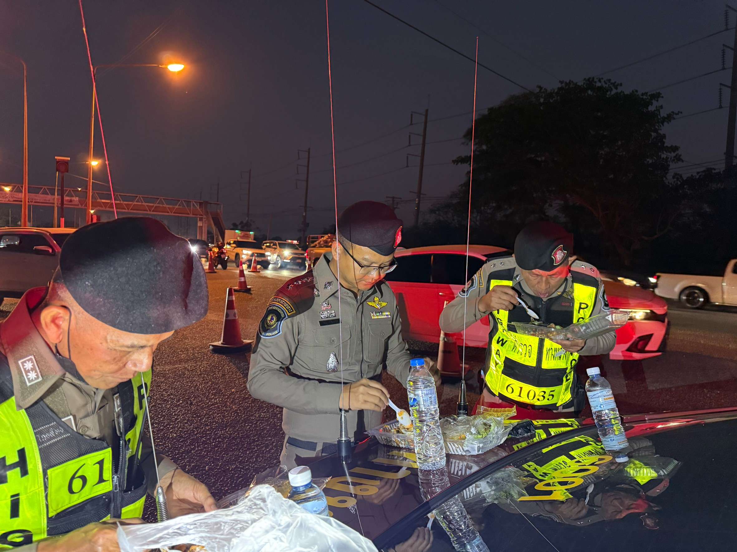 ระหว่างปฏิบัติหน้าที่ เจ้าหน้าที่ไม่สามารถละทิ้งจุดรับผิดชอบได้ จึงร่วมกันรับประทานข้าวกล่องที่นำมาแจกจ่ายบริเวณท้ายรถทางหลวง ควบคู่ไปกับการอำนวยความสะดวกด้านการจราจร เป็นภาพสะท้อนการทำงานเสียสละที่ประชาชนคุ้นเคยดีของตำรวจทางหลวง