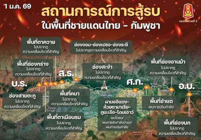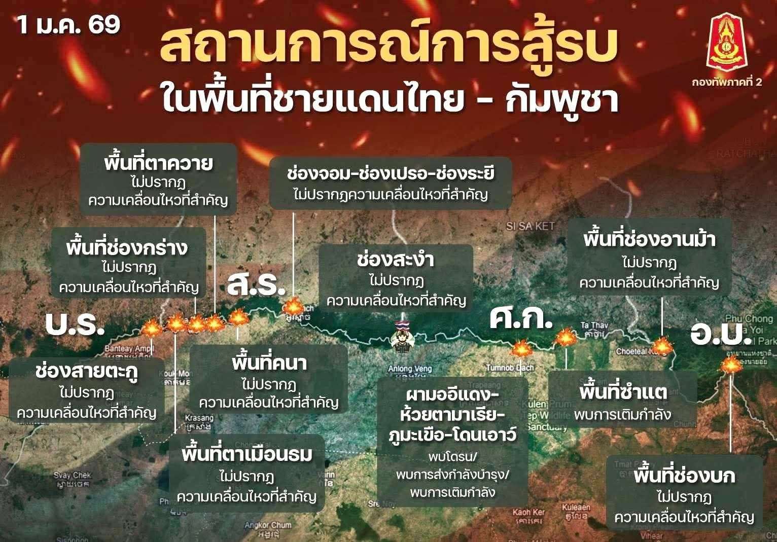 กองทัพภาคที่ 2 สรุปสถานการณ์ ชายแดนไทย–กัมพูชา ภาพรวมสถานการณ์ประจำวันที่ 1 มกราคม 2569 ว่า โดยทั่วไปยังไม่เกิดการปะทะด้วยอาวุธ หรือเผชิญหน้าโดยตรง แต่ฝ่ายตรงข้ามยังคงเสริมกำลังและเตรียมความพร้อมเชิงยุทธการอย่างต่อเนื่อง