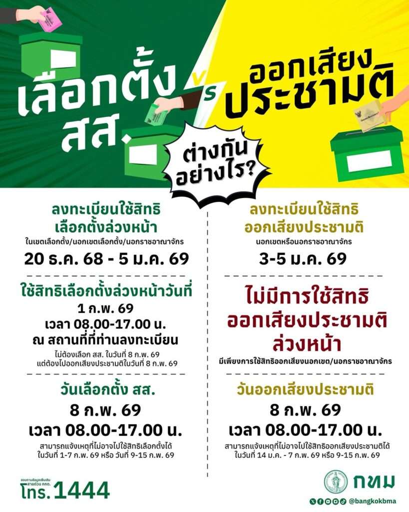 จึงขอเน้นย้ำกำหนดการสำคัญเพื่อให้ประชาชนเตรียมตัวให้พร้อม โดยการใช้สิทธิลงคะแนนล่วงหน้าในครั้งนี้ถูกแบ่งออกเป็น 2 วัน คือ – วันอาทิตย์ที่ 1 กุมภาพันธ์ 2569 เป็นวันลงคะแนนเลือกตั้งสมาชิกสภาผู้แทนราษฎร (สส.) ล่วงหน้า สำหรับผู้ที่ลงทะเบียนนอกเขตเลือกตั้ง หรือนอกราชอาณาจักรไว้ – วันอาทิตย์ที่ 8 กุมภาพันธ์ 2569 เป็นวันออกเสียงประชามติ สำหรับผู้ที่ลงทะเบียนขอใช้สิทธินอกเขตพื้นที่ไว้