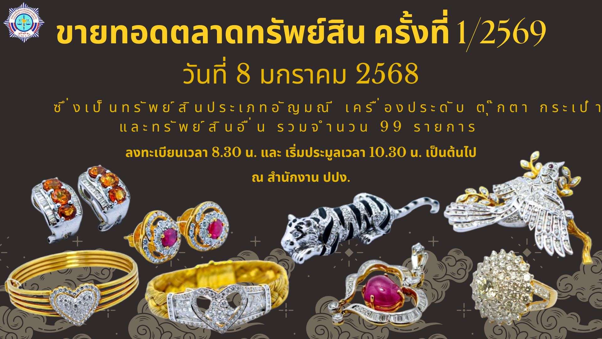 สำนักงาน ปปง. จะทำการขายทอดตลาดทรัพย์สินโดยวิธีการประมูลปากเปล่า ครั้งที่ 1/2569 ซึ่งเป็นทรัพย์สินประเประเภทประเภทอัญมณี เครื่องประดับ ตุ๊กตา กระเป๋า และทรัพย์สินอื่น จำนวน 99 รายการ โดยจะทำการขายทอดตลาดทรัพย์สินในวันที่ 8 มกราคม 2569 ลงทะเบียนตั้งแต่เวลา 08.30 น. เริ่มประมูลเวลา 10.30 น. เป็นต้นไป ณ บริเวณชั้น 1 อาคารสำนักงาน ปปง. โดยมีรายการทรัพย์สิน ที่น่าสนใจ ดังนี้