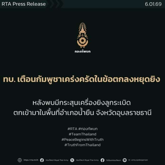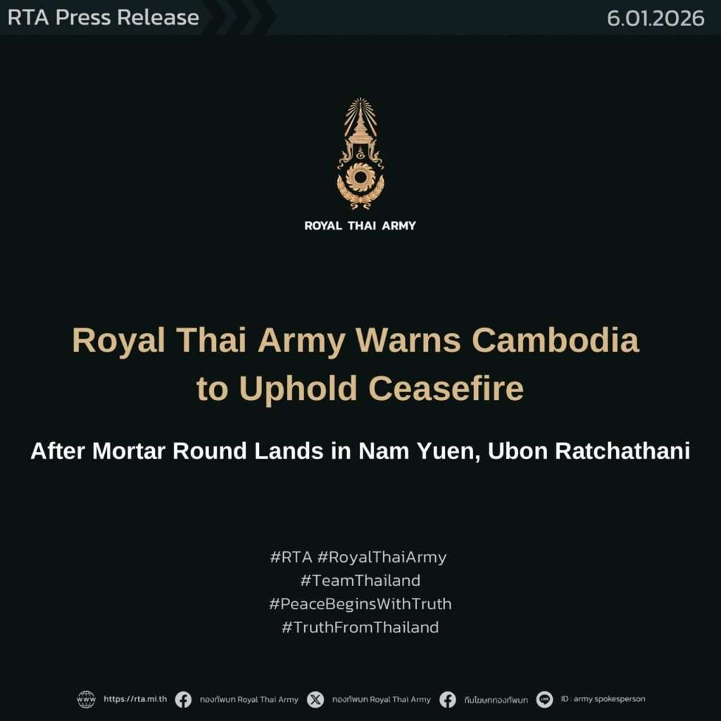 Rear Admiral Paraj Ratanajaipan, Spokesperson of the Royal Thai Navy, strongly condemns the incident in which Cambodian forces fired a mortar ammunition into Thai territory in Nam Yuen District, Ubon Ratchathani Province, in front of Hill 469, at approximately 07:25 hours on the morning of 6 January 2026. This act constitutes a clear violation of the ceasefire agreement and resulted in injuries to one Thai soldier.