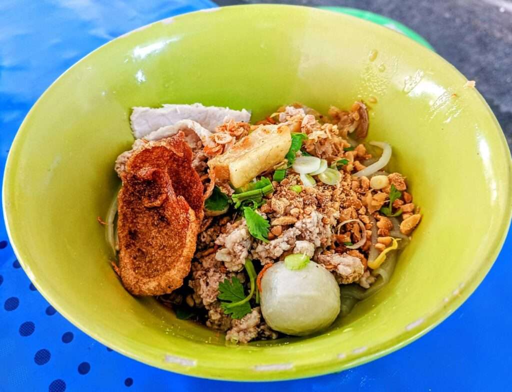 เมนูที่ 2 ก๋วยเตี๋ยวหมูโบราณ แห้งชาม – น้ำชาม ในราคาชามละ 20 บาท ก๋วยเตี๋ยวที่ร้านนี้ จะเน้นหมูสับ ลูกชิ้นหมู และปลาสวรรค์ทอดกรอบ รสชาติดีคุ้มราคามากๆ
