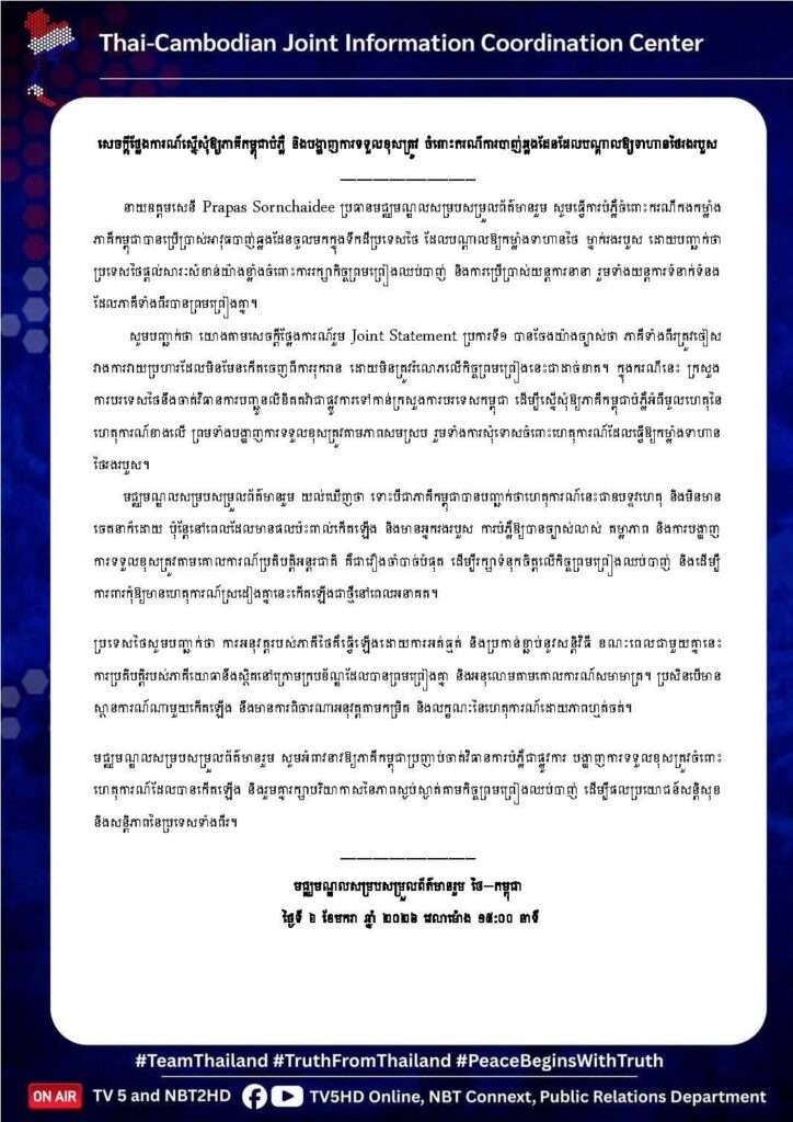 ทั้งนี้ ศูนย์ประสานข้อมูลข่าวสารร่วม ฯ เห็นว่า แม้ฝ่ายกัมพูชาจะระบุว่าเหตุการณ์ดังกล่าวเป็นอุบัติเหตุและไม่ได้มีเจตนา แต่เมื่อมีผลกระทบเกิดขึ้นและมีผู้ได้รับบาดเจ็บ การชี้แจงที่ชัดเจน โปร่งใส และการแสดงความรับผิดชอบตามหลักปฏิบัติสากล จึงเป็นสิ่งจำเป็นอย่างยิ่ง ทั้งนี้ เพื่อรักษาความเชื่อมั่นต่อข้อตกลงหยุดยิง และเพื่อป้องกันมิให้เกิดเหตุการณ์ลักษณะเดียวกันขึ้นอีกในอนาคต