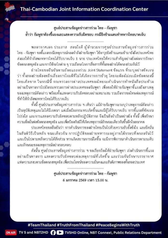 ศูนย์ประสานข้อมูลข่าวสารร่วม ไทย-กัมพูชา ย้ำ กัมพูชาต้องชี้แจงและแสดงความรับผิดชอบ กรณียิงข้ามแดนทำทหารไทยบาดเจ็บ