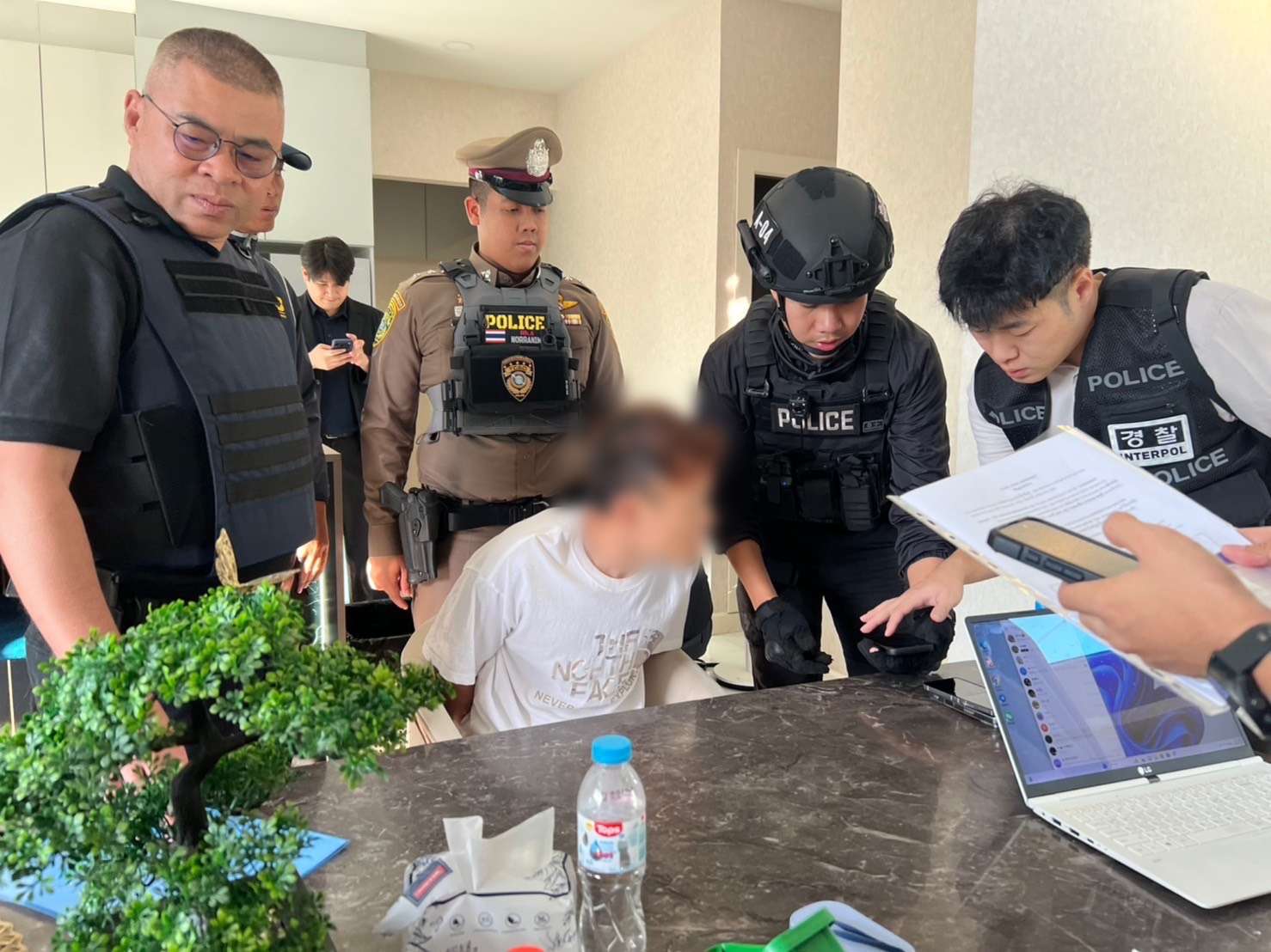 เจ้าหน้าที่ตำรวจ กก.1 บก.ปอท. ชุดจับกุมประกอบด้วย พ.ต.ท.เอกพล แสงอรุณ, พ.ต.ท.ธีรภพ พันธุชาติ รอง ผกก.1 บก.ปอท., พ.ต.ท.ณัฐวุฒิ มาระตา รอง ผกก.(สอบสวน) กก.1 บก.ปอท., พ.ต.ท.หญิง หทัยชนก อินทรวิจิตร, พ.ต.ต.กษิดิศ ดิลกคุณานันท์ สว.กก.1 บก.ปอท., ร.ต.อ.ทัศพงษ์ ผ่องใส, ร.ต.อ.ปฏิญญา สงวนศักดิ์เกษร รอง สว.กก.1 บก.ปอท., ด.ต.พีรวุฒิ โชติช่วง, ด.ต.พงศ์เทพ เลิศพิภพ, ด.ต.หญิง วาสนา ภารา, จ.ส.ต.กฤติเดช หอละเอียด, จ.ส.ต.ปิติภัทร พวงสมบัต ผบ.หมู่ กก.1 บก.ปอท ร่วมกับ เจ้าหน้าที่แผนกกงสุลตำรวจสถานเอกอัครราชทูตสาธารณรัฐเกาหลีประจำประเทศไทย, เจ้าหน้าที่ตำรวจ กลุ่มงานสนับสนุนฯ บก.ปอท. และเจ้าพนักงานตำรวจ กก.สืบสวน บก.ตม.
