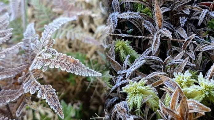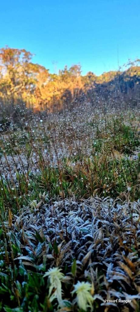 ส่วนที่หน่วยพิทักษ์ป่าโคกนกกระบา ภูหลวง พบอากาศหนาวจัดยิ่งกว่า โดยสถานีตรวจวัดอุณหภูมิบันทึกค่าต่ำสุดเพียง 4 องศาเซลเซียส ส่งผลให้เกิด “แม่คะนิ้ง” เกาะตามยอดหญ้า ใบไม้ และพื้นดิน สร้างทัศนียภาพสีขาวระยิบระยับราวกับธรรมชาติถูกแต่งแต้มด้วยผลึกน้ำแข็ง