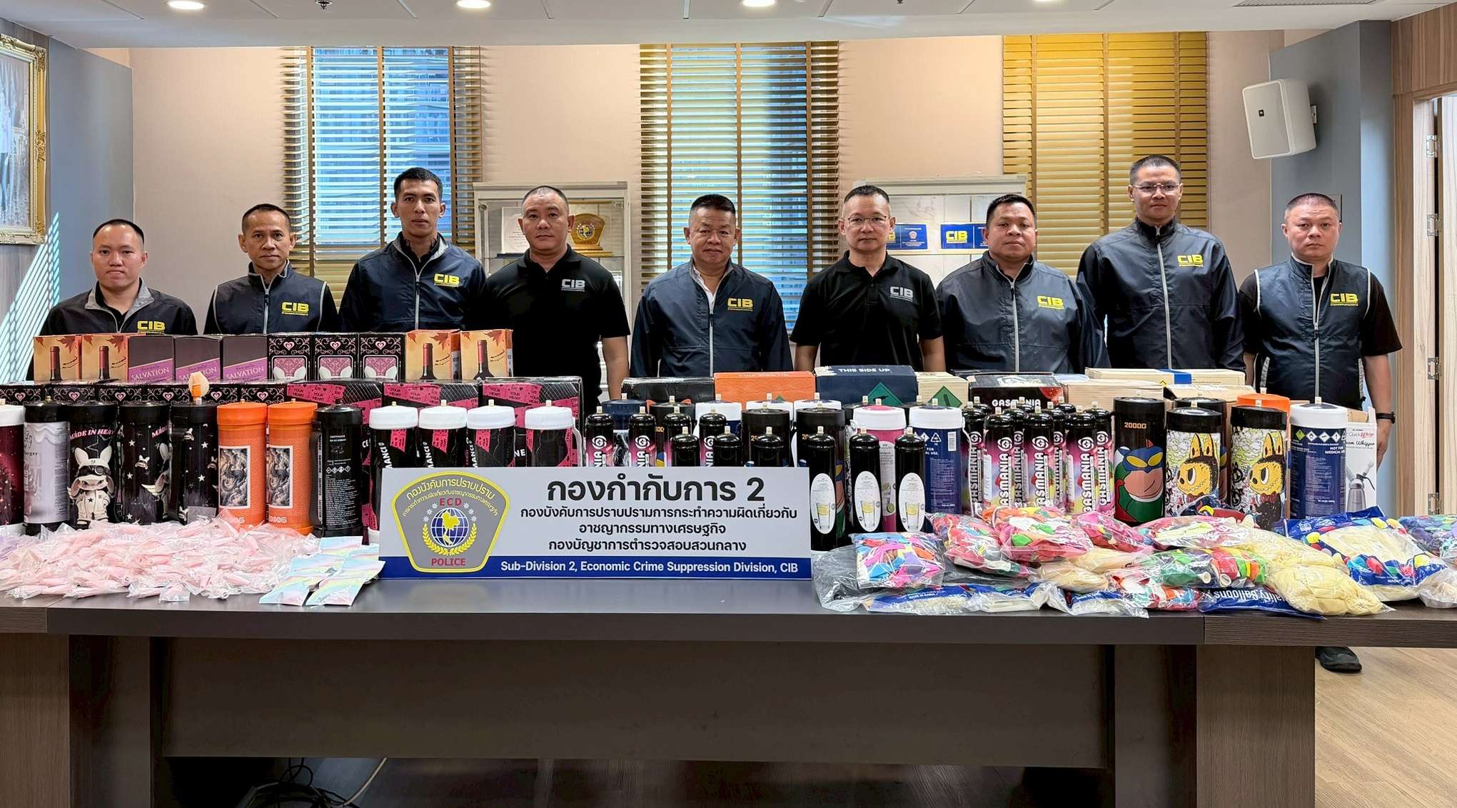 ตำรวจสอบสวนกลาง (CIB) โดยกองบังคับการปราบปรามการกระทำความผิดเกี่ยวกับอาชญากรรมทางเศรษฐกิจ (บก.ปอศ.) เปิดปฏิบัติการเชิงรุก บุกทลายแหล่งซุกซ่อน “แก๊สหัวเราะ” หรือแก๊สไนตรัสออกไซด์ ที่ลักลอบนำเข้าจากต่างประเทศโดยไม่ผ่านพิธีการศุลกากร สามารถตรวจยึดของกลางรวม 204 กระบอก มูลค่ากว่า 400,000 บาท พร้อมจับกุมผู้ต้องหา 2 ราย