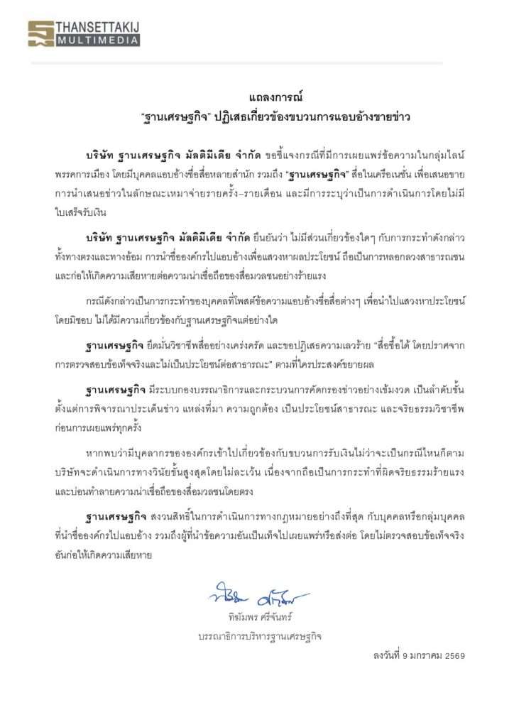 บริษัท ฐานเศรษฐกิจ มัลติมีเดีย จำกัด ยืนยันว่า ไม่มีส่วนเกี่ยวข้องใดๆ กับการกระทำดังกล่าว ทั้งทางตรงและทางอ้อม การนำชื่อองค์กรไปแอบอ้างเพื่อแสวงหาผลประโยชน์ ถือเป็นการหลอกลวงสาธารณชน และก่อให้เกิดความเสียหายต่อความน่าเชื่อถือของสื่อมวลชนอย่างร้ายแรง