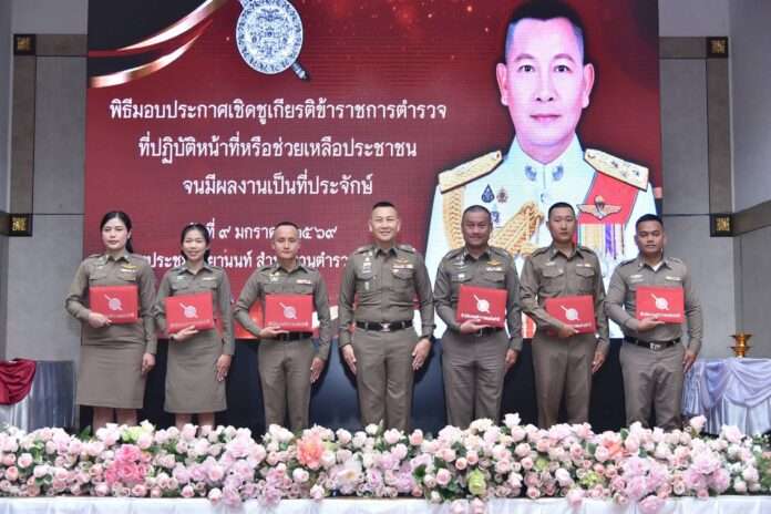 จากนั้น ผบ.ตร.ได้เป็นประธานมอบประกาศเกียรติคุณเชิดชูเกียรติข้าราชการตำรวจที่มีจิตวิญญาณของผู้พิทักษ์สันติราษฎร์ มีความกล้าหาญ และเสียสละ จนเป็นที่ประจักษ์ต่อสังคม ในห้วงเดือนพฤศจิกายน 2568 ถึงเดือนมกราคม 2569 อันเป็นการสร้างขวัญกำลังใจและเป็นแบบอย่างที่ดีแก่ข้าราชการตำรวจ ตามนโยบายการบริหารราชการของสำนักงานตำรวจแห่งชาติ โครงการ “ทำดีมีรางวัล ทำไม่ดีมีโทษ” โดยมีข้าราชการตำรวจผู้สมควรได้รับประกาศนียบัตรเชิดชูเกียรติ “ทำดีมีรางวัล” ณ ห้องศรียานนท์ อาคาร 1 สำนักงานตำรวจแห่งชาติ จำนวน 6 ราย ได้แก่