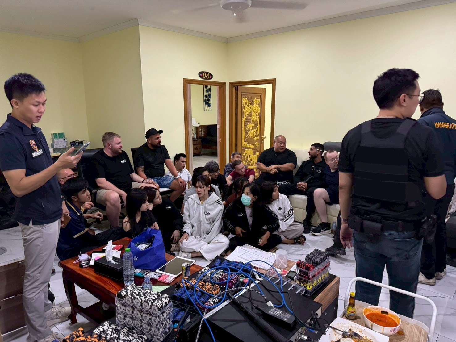 เวลาประมาณตีสองครึ่ง ของวันที่ 10 มกราคม 2569 เจ้าหน้าที่ตำรวจ กก.สส.บก.ตม.3 จึงได้นำกำลังชุดปฏิบัติการพิเศษ พร้อมอาวุธครบมือ ปฏิบัติการสายฟ้าแลบ เข้าล็อกตัวคนดูต้นทางและ เปิดประตูบุกเข้าตรวจค้นภายในบ่อนดังกล่าวพบผู้ต้องหาชาวต่างชาติ หลายสัญชาติรวมนับสิบราย กำลังเล่นพนันโป๊กเกอร์เอาทรัพย์สินเป็นชิปแลกเงินสดกัน เจ้าหน้าที่ได้แสดงตนเป็นเจ้าหน้าที่ตำรวจ และออกคำสั่งให้ทุกคนอยู่ในความสงบและนอนราบลงกับพื้น แต่คนต่างชาติกลับพยายามเก็บเงินสดและชิปแลกเงินวิ่งกระจัดกระจายไปคนละทิศทาง เจ้าหน้าที่ต้องไล่ติดตามจับกุมอย่างทุลักทุเล ก่อนจะควบคุมตัว ผู้ต้องหาทั้งหมดได้ในเวลาต่อมา เมื่อสถานการณ์สงบลง เจ้าหน้าที่จึงตรวจสอบเอกสารประจำตัวของแต่ละคน พบว่า มีชาวต่างชาติจำนวน 9 ราย แบ่งเป็นชาวฟินแลนด์ 2 ราย ชาวเดนมาร์ค 2 ราย ชาวอังกฤษ 3 ราย ชาวเยอรมัน และชาวจีน อีกสัญชาติละ 1 ราย