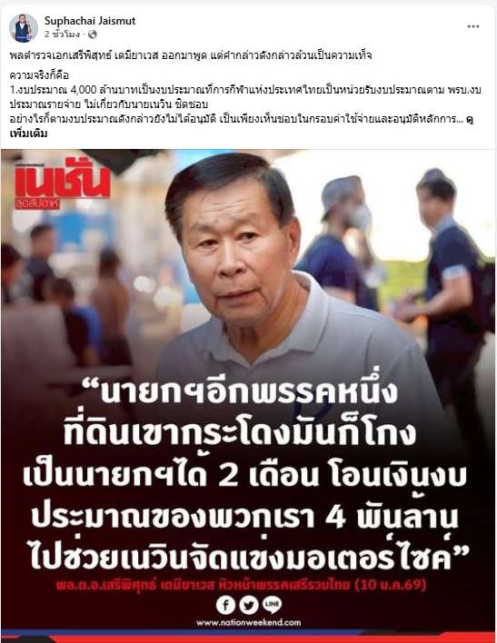 12 ม.ค. 69 – “ศุภชัย” เผยเตรียมดำเนินคดี “พล.ต.อ.เสรีพิศุทธ์” กล่าวใส่ร้ายด้วยความเท็จ ปมที่ดินเขากระโดง-โอนงบฯ ช่วย “เนวิน” จูงใจให้หลงผิดในคะแนนนิยมของผู้สมัคร หรือพรรคการเมือง