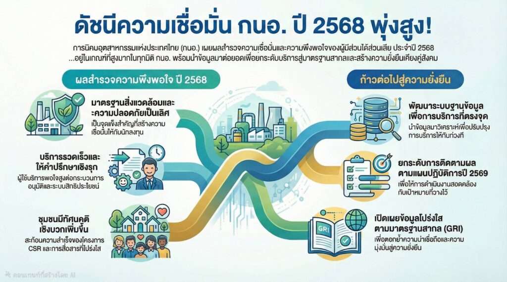 นายสุเมธ กล่าวอีกว่า กนอ. ได้วางแนวทางการพัฒนาเพื่อยกระดับองค์กรอย่างต่อเนื่อง โดยมุ่งเน้นการปรับปรุงระบบติดตามผลให้สอดคล้องกับแผนปฏิบัติการปี 2569 การพัฒนาระบบฐานข้อมูลสารสนเทศเพื่อให้การปรับปรุงบริการตรงจุดและทันท่วงที รวมถึงการเปิดเผยข้อมูลอย่างโปร่งใสผ่านรายงานความยั่งยืนตามมาตรฐานสากล (GRI) เพื่อตอกย้ำความเชื่อมั่นต่อสาธารณะ