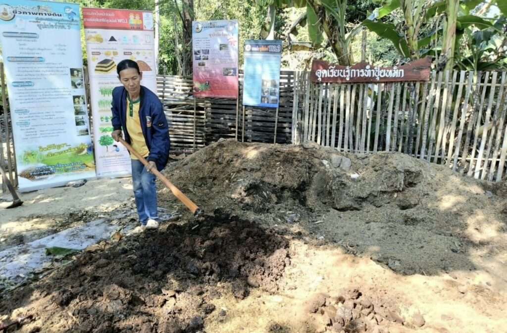 สำหรับในเรื่องของการปรับปรุงบำรุงดิน ผลิตปุ๋ยหมักจากสารเร่งซุปเปอร์ พด.1 ผลิตน้ำาหมักสับปะรดจากสารเร่งซุปเปอร์ พด.2 ผลิตน้ำหมักจากหญ้าเนเปียร์ ทดแทนการใช้ปุ๋ยยูเรีย จุลินทรีย์สังเคราะห์แสง และน้ำหมักชีวภาพจากปลา เร่งการเจริญเติบโตของพืช สารควบคุมแมลงศัตรูพืชจากสารเร่งซุปเปอร์ พด.7 โดยใช้สมุนไพรในแปลง และขยายเชื้อจุลินทรีย์ พด.14 ทำเป็นรูปแบบแห้ง สะดวกต่อการเก็บรักษานานถึง 6 เดือน สามารถยับยั้งการระบาดของโรคพืชในแปลงผัก ปลูกพืชปุ๋ยสดปอเทือง หมุนเวียนหลังปลูกข้าว มีการประดิษฐ์รถไถกลบตอซังจากยางรถยนต์เก่านำกลับมาหมุนเวียนให้เกิดประโยชน์