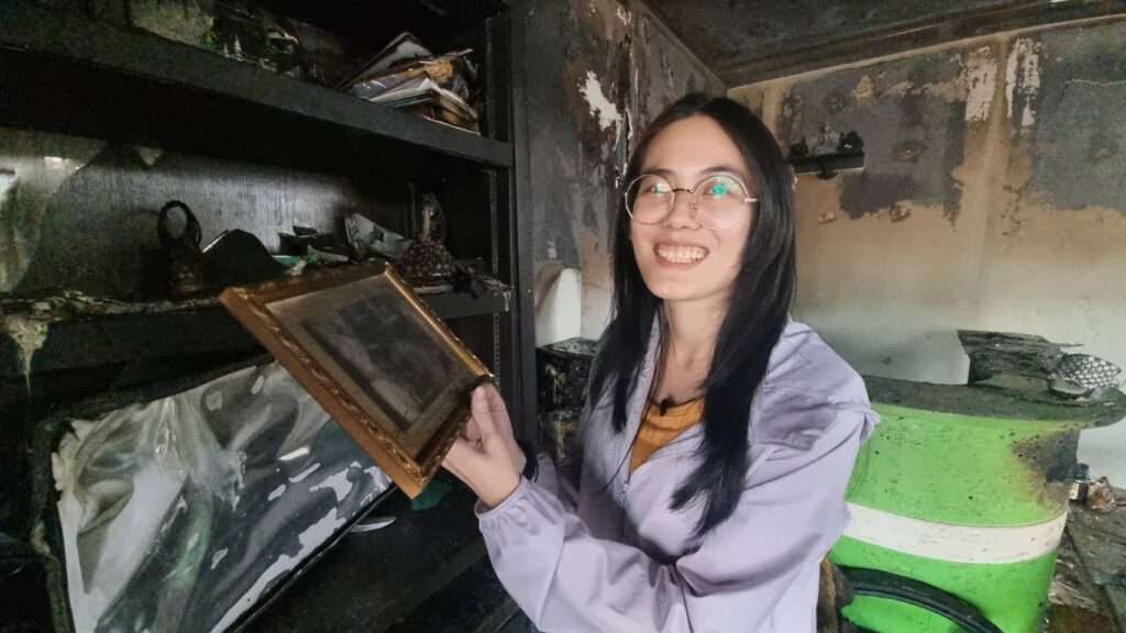 ซึ่งในขณะเดียวกัน น.ส.อัญชลีภัสร์ ซึ่งเป็นเจ้าของร้านขายของชำได้เดินเข้าไปดูด้านในออฟฟิศจึ่งพบว่ารูปภาพ ราชกาลที่ 9 ก้มกราบ สมเด็จย่า ที่ใส่กรอบตั้งเอาไว้ตามชั้นเพลิงไม่รุกไหม้มีกระจกแตกที่มุมนิดเดียวซึ่งทุกอย่างไฟไหม้จนหมดไม่เหลืออะไร