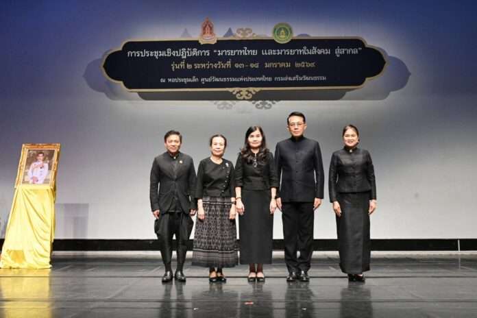 กรุงเทพฯ, วันที่ 13 มกราคม – นางยุถิกา  อิศรางกูร ณ อยุธยา อธิบดีกรมส่งเสริมวัฒนธรรม (สวธ.) เป็นประธานในพิธีเปิดการประชุมเชิงปฏิบัติการ “มารยาทไทย และมารยาทในสังคมสู่สากล” รุ่นที่ 2 โดยมีนายบันเทิง เพียรค้า ผู้อำนวยการกลุ่มค่านิยมและความเป็นไทย รักษาราชการแทนผู้อำนวยการสถาบันวัฒนธรรมศึกษา คณะผู้ทรงคุณวุฒิทางด้านมารยาทไทยและมารยาทในสังคม ข้าราชการ และผู้เข้าร่วมกิจกรรม เข้าร่วมพิธี ณ หอประชุมเล็ก ศูนย์วัฒนธรรมแห่งประเทศไทย
