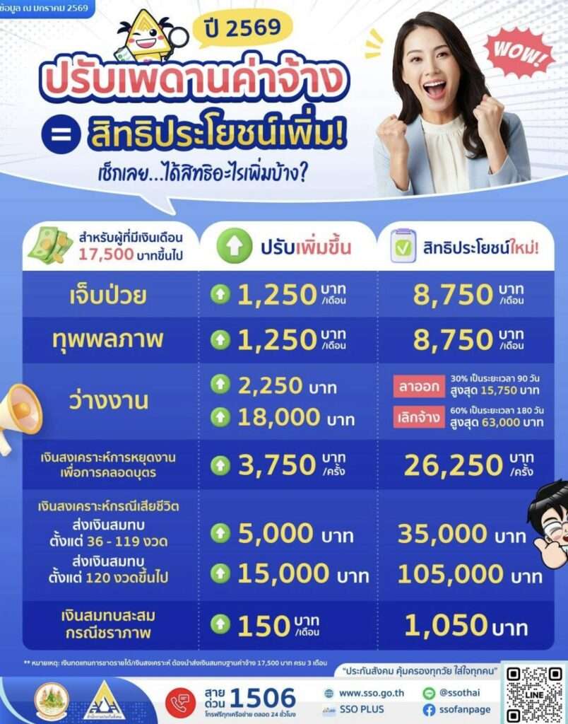 เมื่อวันที่ 16 มกราคม 2569 ผู้สื่อข่าวไทยแทบลอยด์ รายงานว่า สำนักงานประกันสังคมประกาศปรับ ฐานค่าจ้างสูงสุดเป็น 17,500 บาทต่อเดือน ตั้งแต่ปี 2569 เป็นต้นไป ส่งผลให้สิทธิประโยชน์ด้านการคุ้มครองต่าง ๆ เพิ่มขึ้นอย่างชัดเจน ครอบคลุมตั้งแต่ เจ็บป่วย ว่างงาน คลอดบุตร เสียชีวิต ไปจนถึงชราภาพ การปรับฐานค่าจ้างครั้งนี้ มีเป้าหมายให้สอดคล้องกับภาวะค่าครองชีพในปัจจุบัน และสร้างความมั่นคงให้ผู้ประกันตนในทุกช่วงชีวิต โดยผู้ที่มีเงินเดือนตั้งแต่ 17,500 บาทขึ้นไป และส่งเงินสมทบ ครบอย่างน้อย 3 เดือน จะได้รับสิทธิประโยชน์เพิ่มขึ้นทันที