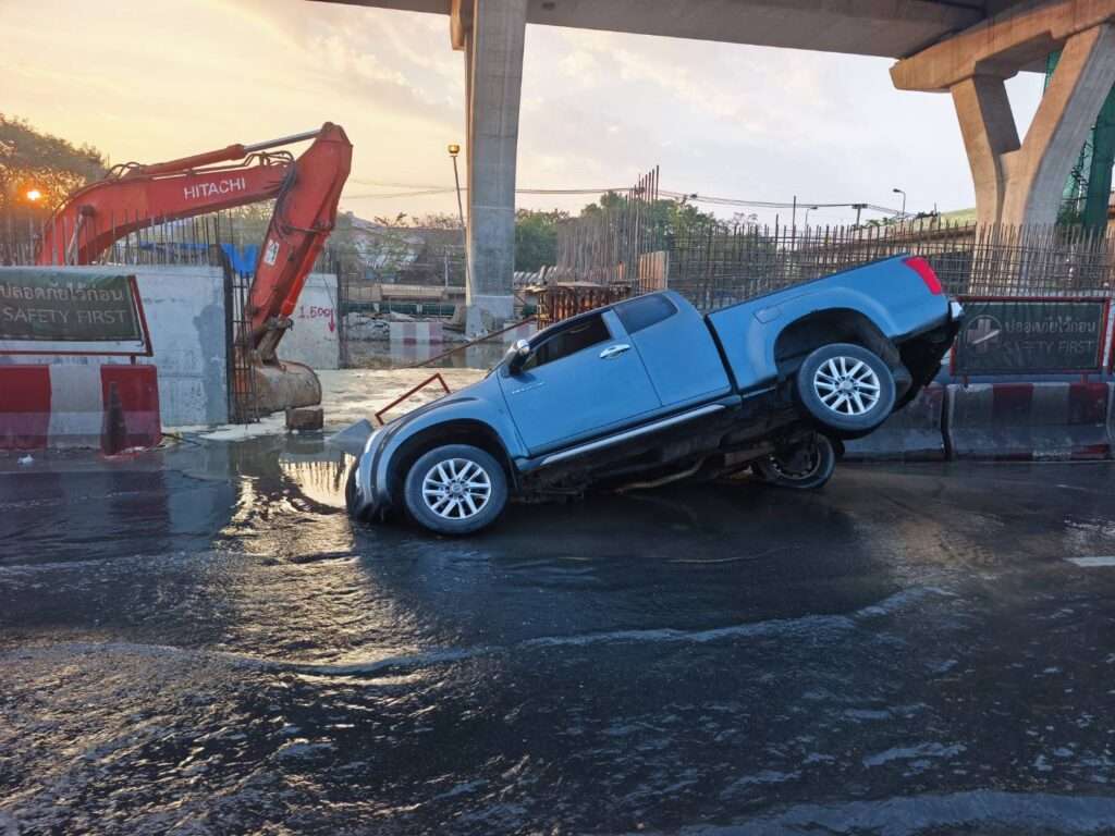 รถกระบะประสบเหตุตกลงไปในจุดถนนพระราม2 ทรุดตัว ทับท่อประปาแตกน้ำท่วมถนนการจราจรติดขัด